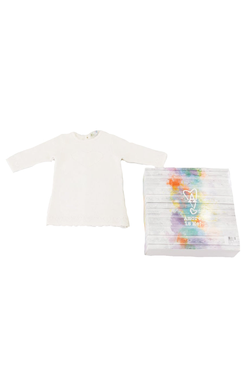 Abito in maglia lavorata a Tema Cuore. chiusura posteriore a bottoni con decorazione sul fondo.Confezione regalo a cassetto inclusa Capo preferibilmente utilizzabile in inverno LAVARE A 30° IN LAVATRICE - NON STIRARE - NON LAVABILE CON I COLORI CHIARI - NON USARE CANDEGGINA made in Bangladesh composizione 88% VI 5% PA 2% PL 5% EA