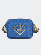 Borsa con marchio "MK" nel tessuto rivestito. Tessuto rivestito in oro liscio con badge del cuore frontale e con dettagli Rivestiti in poliestere. Apertura di cerniera metallica con marchio d'oro. Michael Kors Stampato su spallone con due strisce regolabile con fibbia dorata. Finitura pulita con bordo dipinto in colore contrasto. (2 in 1 = due modi per indossarlo: 1- verticale 2- sulla cintura). Dimensioni: 10.5x16x5cms.