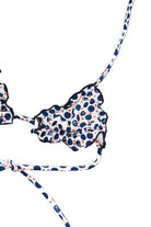 Costume in Lycra foderata a fantasia pois marinara. Modello Triangolo con cordino regolabile nella parte anteriore e slip elasticizzato arricciato