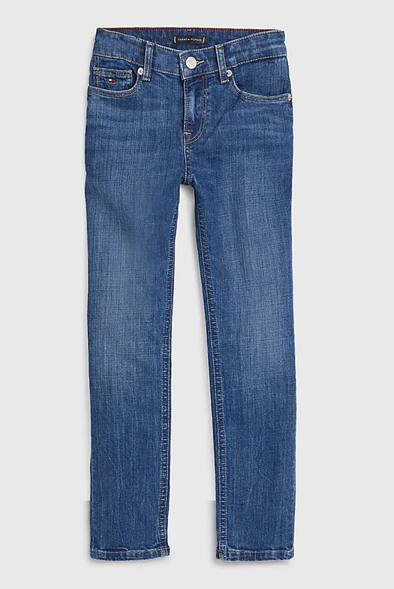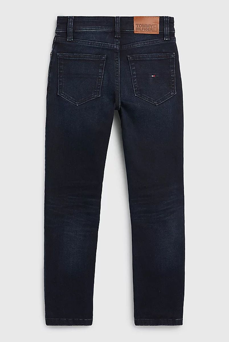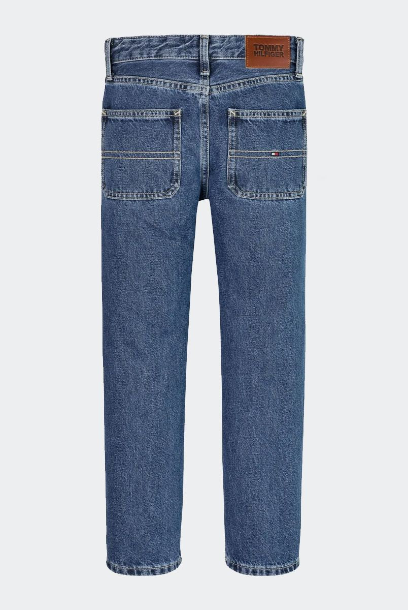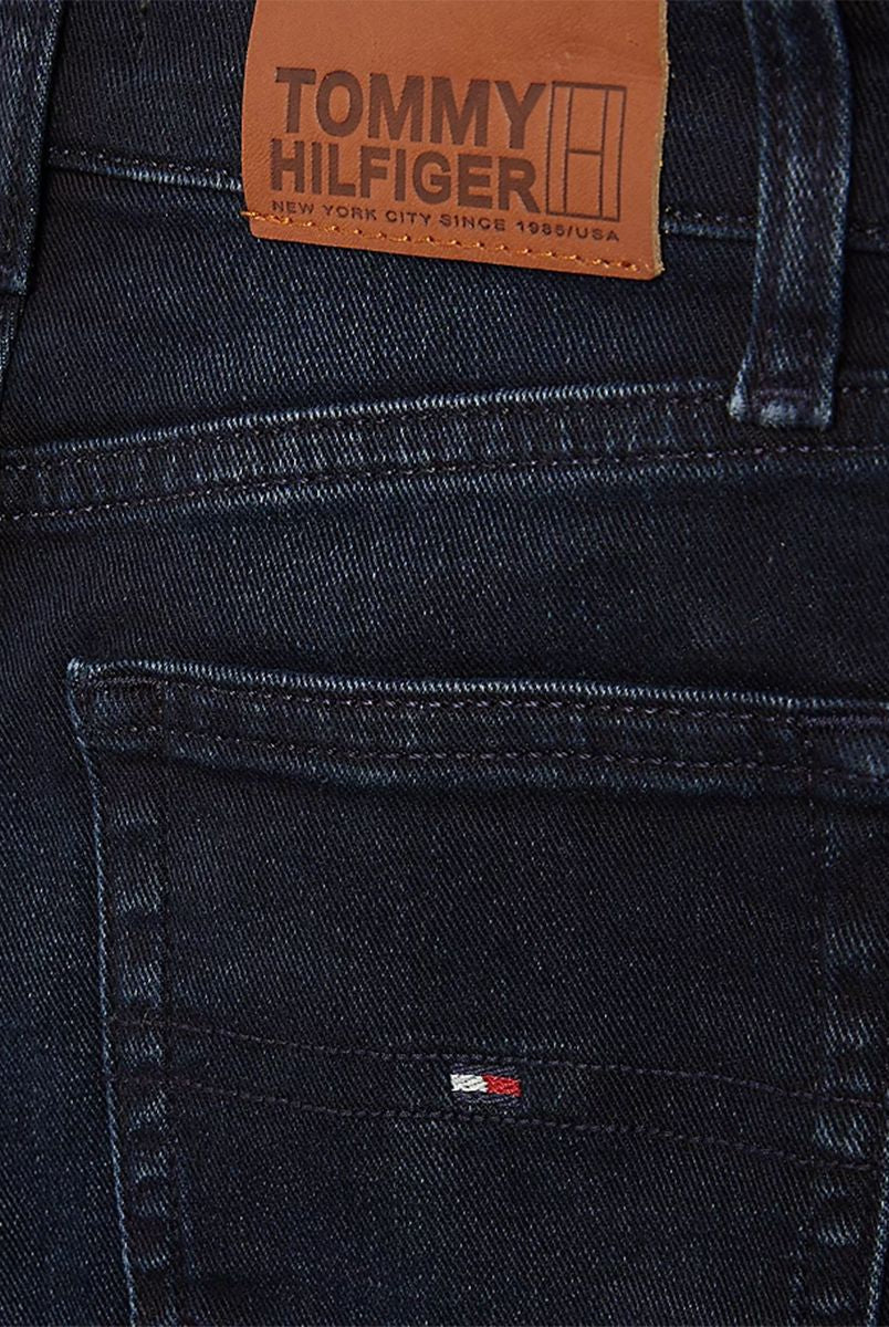 Jeans per ragazze realizzati in cotone riciclato certificato morbido resistente e sostenibile vestibilità confortevole vita alta e taglio ampio jeans di tendenza in denim nero elegante e versatile dettagli curati con stemma TH ricamato tasca posteriore bandierina Tommy Hilfiger sul taschino portamonete cinque tasche chiusura con zip e bottone qualità e stile firmati Tommy Hilfiger distribuiti da Bimbivip partner storico affidabile sicuro e riconosciuto in Europa punto di riferimento per le famiglie alla ricerca di originalità qualità e marchi prestigiosi esperienza d’acquisto soddisfacente sicura e appagante