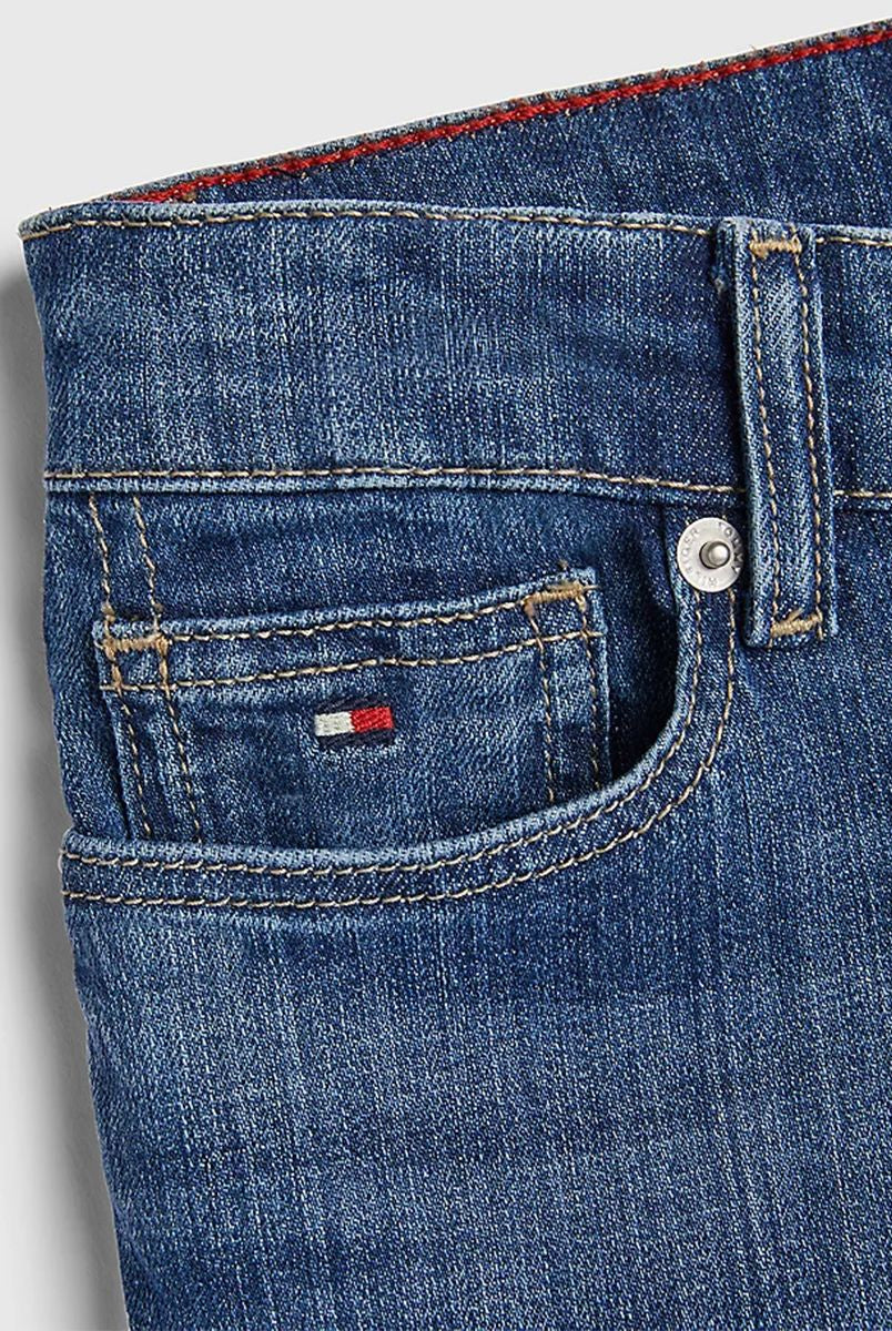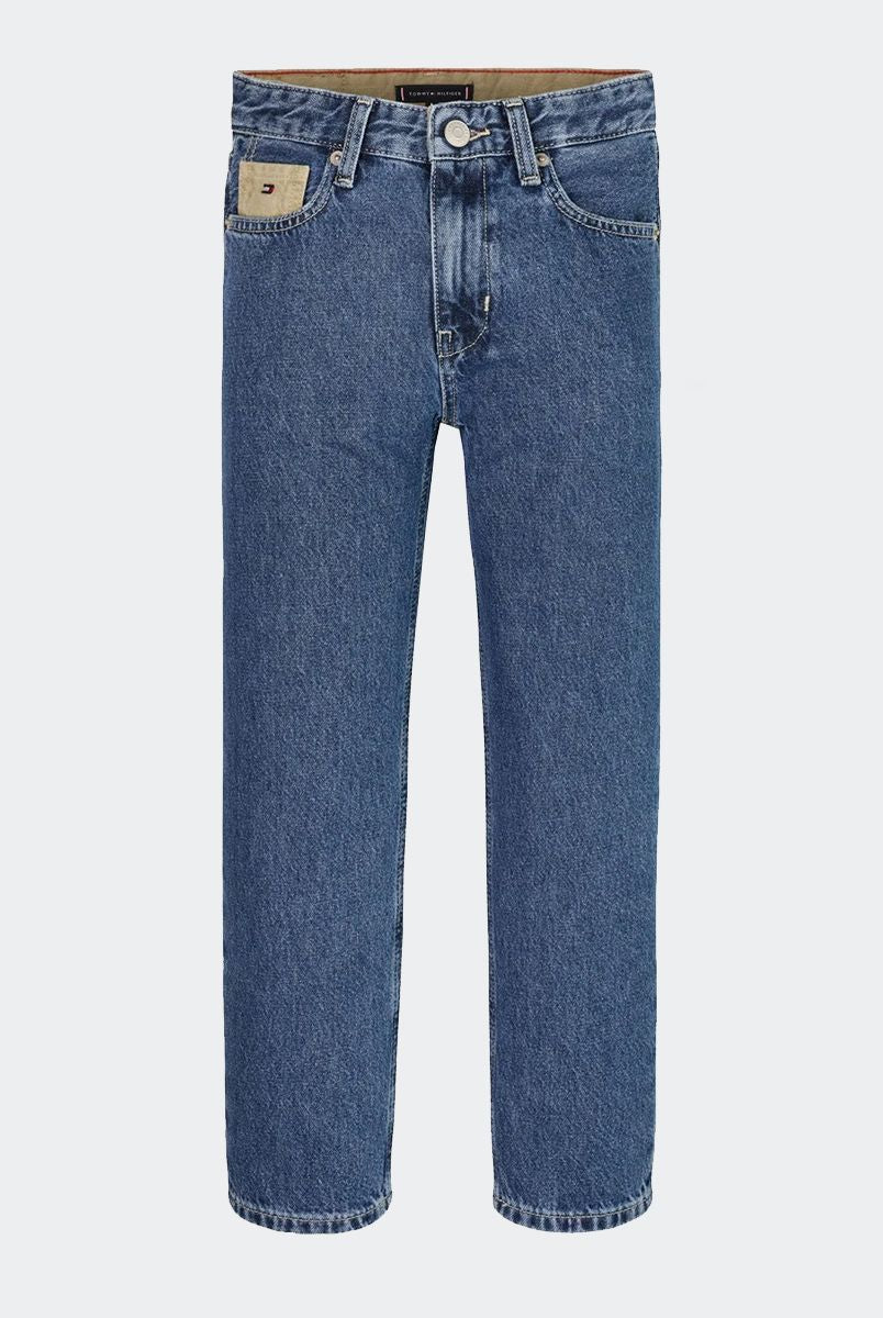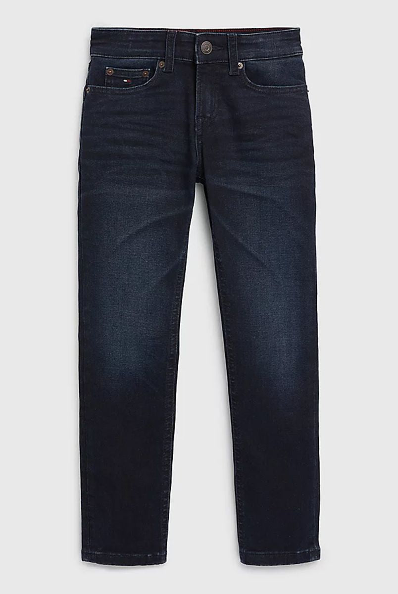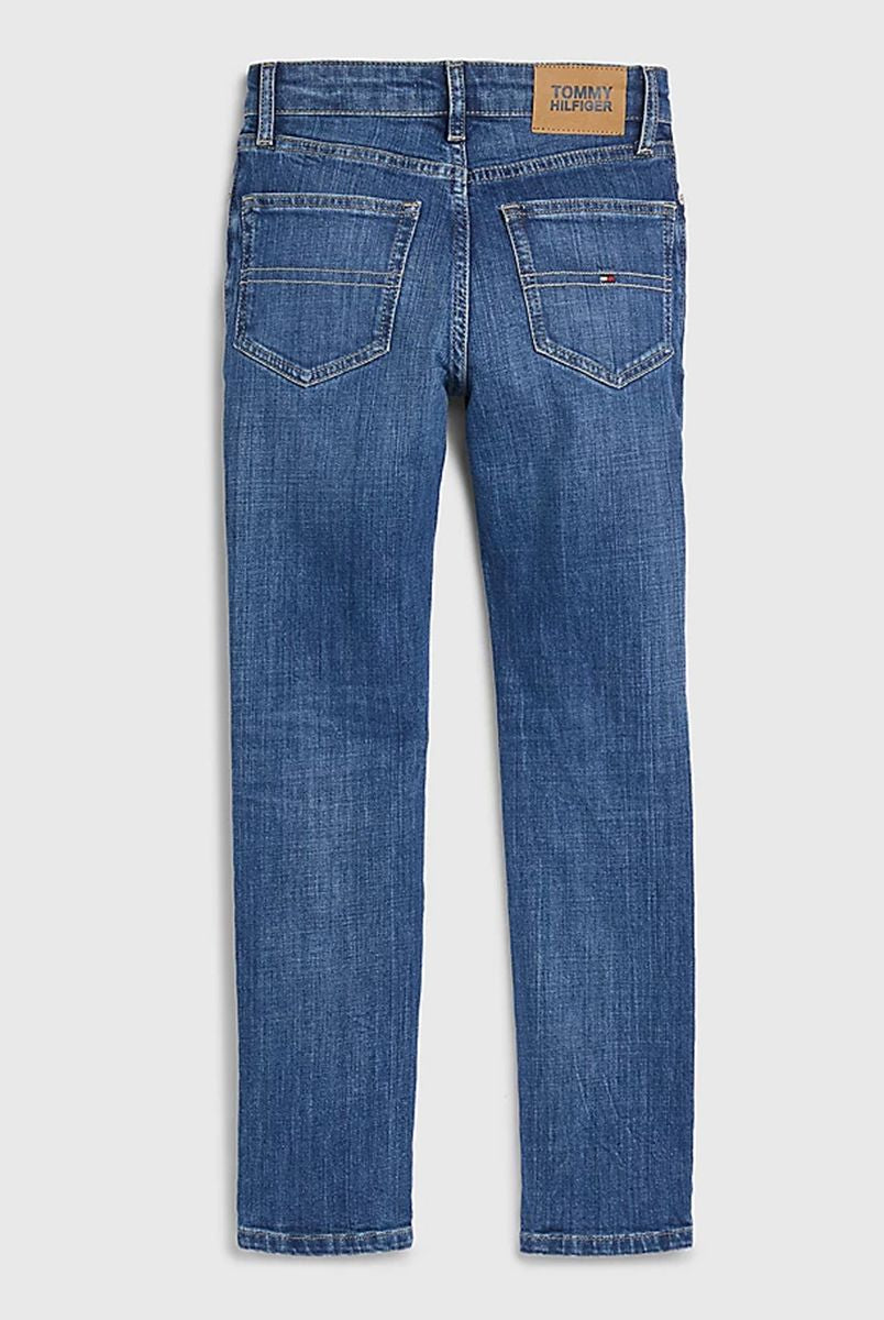 Jeans per ragazze realizzati in cotone riciclato certificato morbido resistente e sostenibile vestibilità confortevole vita alta e taglio ampio jeans di tendenza in denim nero elegante e versatile dettagli curati con stemma TH ricamato tasca posteriore bandierina Tommy Hilfiger sul taschino portamonete cinque tasche chiusura con zip e bottone qualità e stile firmati Tommy Hilfiger distribuiti da Bimbivip partner storico affidabile sicuro e riconosciuto in Europa punto di riferimento per le famiglie alla ricerca di originalità qualità e marchi prestigiosi esperienza d’acquisto soddisfacente sicura e appagante