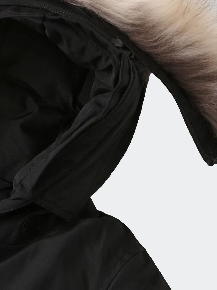 Piumino in tessuto Ramar con certificato RDS idrorepellente antivento rivestito in Teflon con Imbottitura in piuma d'anatra 70/30.Chiusura con zip nascosta e bottoni a pressione. Cappuccio protettivo con inserto in pelliccia staccabile. Tasche diagonali con patta. polsi interni a coste. etichetta laterale