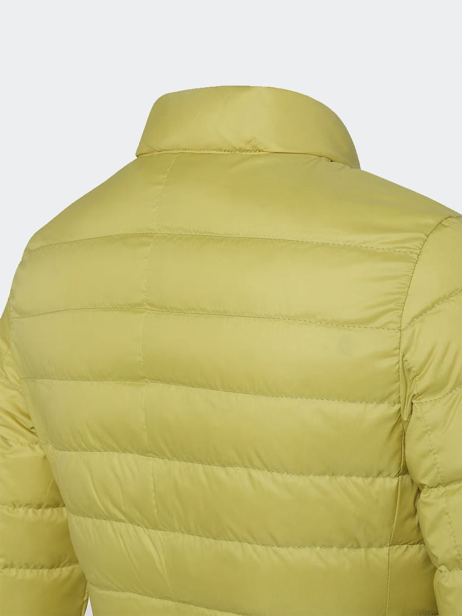 Piumino in nylon super leggero e compatto di poliestere 100% riciclato post consumo. Imbottito in piuma riciclata. Idrorepellente e antivento. Full zip centrale con doppio cursore e tasche laterali