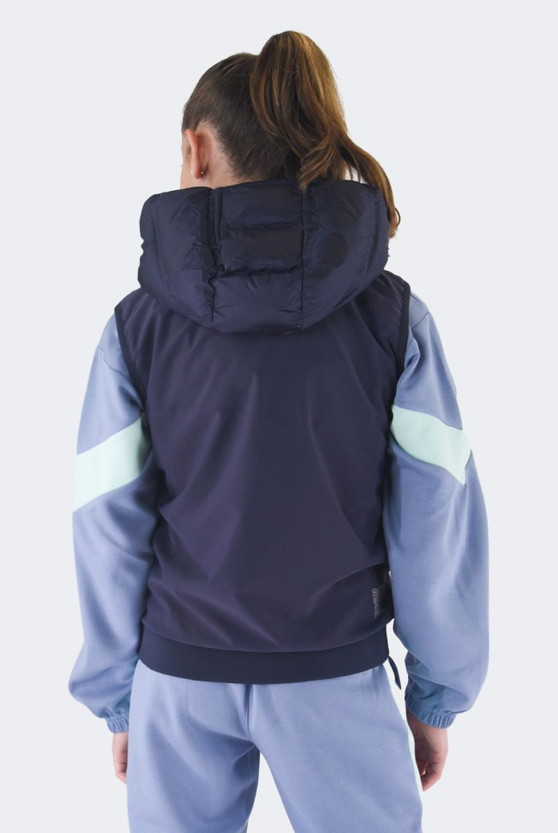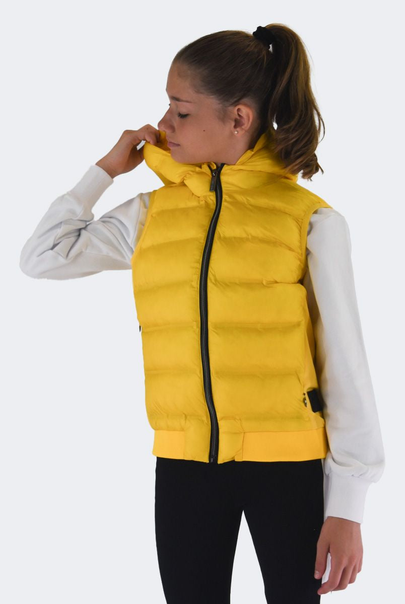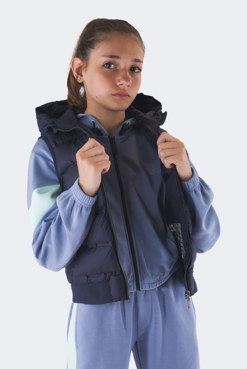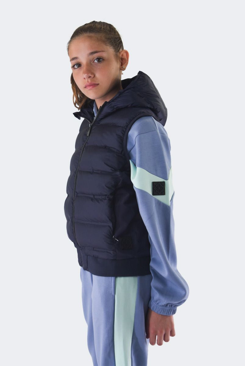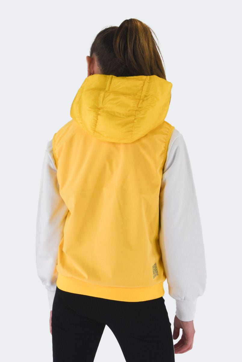 Smanicato tinta unita con collo a cappuccio. Monopetto senza maniche. interno in Ecopiuma. multitasche con zip. Modello pratico e elasticizzato. Fondo e polsi con costina elastica e patch Logo sul fondo lato sinistro