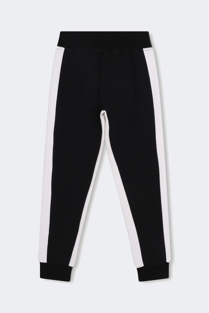 Sottotuta con elastico in vita regolabile con lacci. Tasche laterali a taglio dritto aperte con scritta Logo sutto la tasca destra in orizzontale. Con polsini e Logo applicato sul finale.