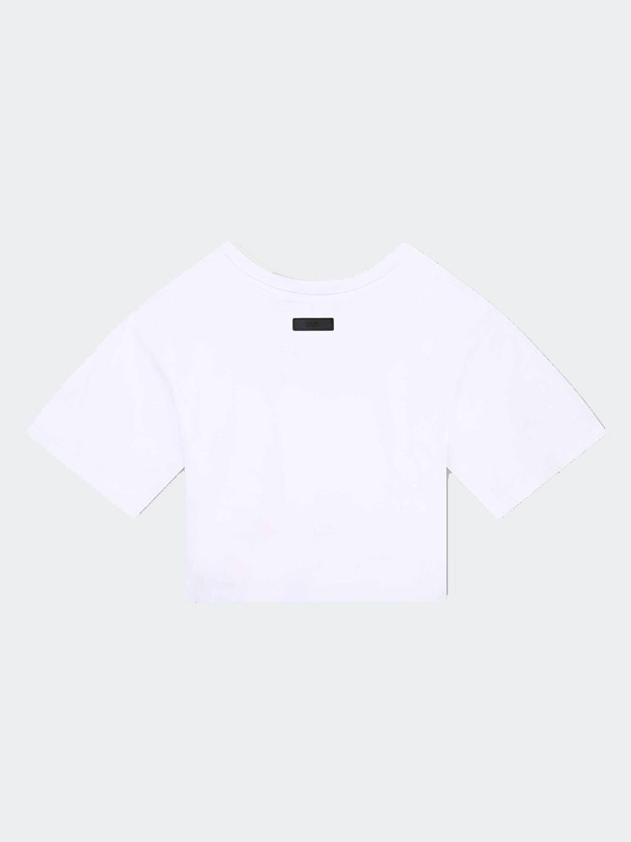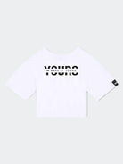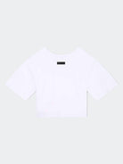 T-shirt cropped tinta unita girocollo a manica corta con Maxi scritta frontale. Logo applicato sulla manica sinistra.