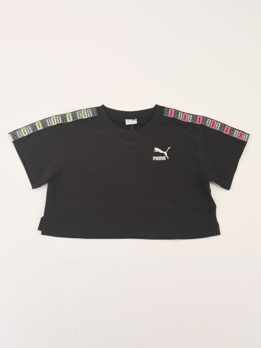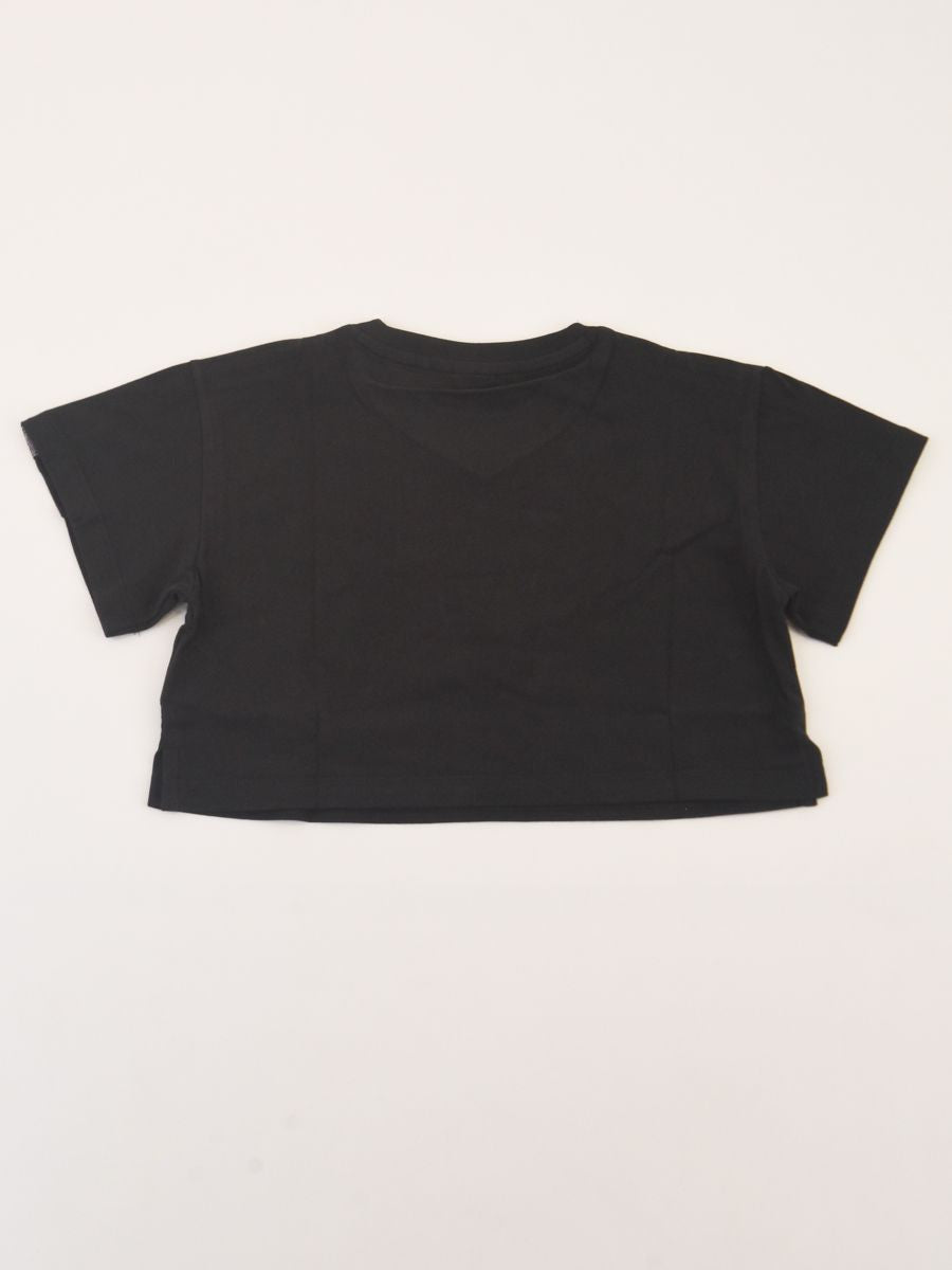 T-shirt girocollo Cropped tinta unita a manica corta con banda a rilevo su spalla e manica del logo. Collo a costine. Taglio corto con stampa lato cuore riflettente