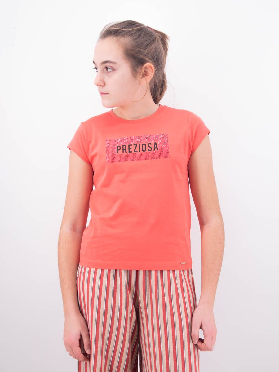 T-shirt girocollo manica corta con stampa PREZIOSA con cornice in Glitter