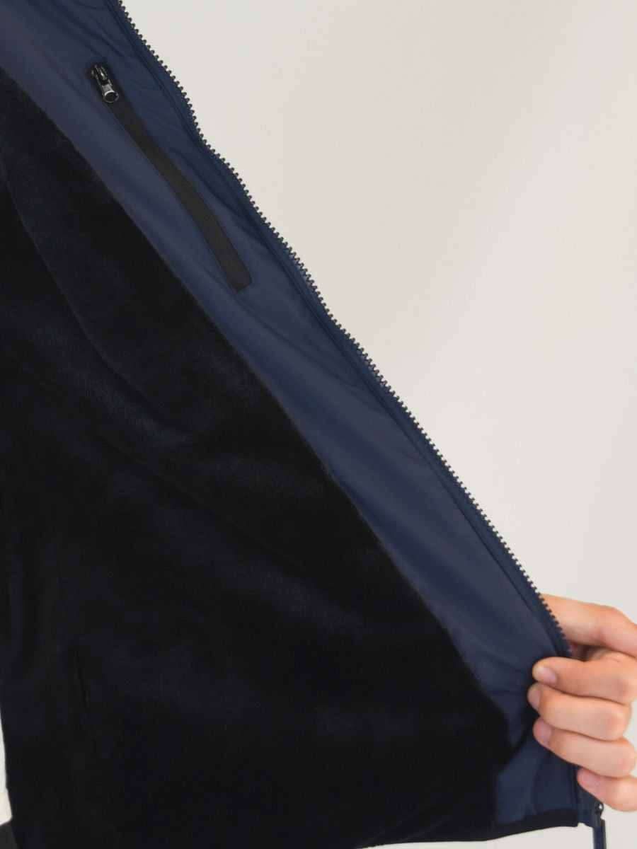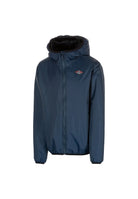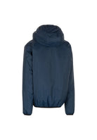 Giubbino modello con apertura fullzip e cappuccio con bordino. Mini patch logo applicata sul cuore. Pratiche tasche in vita.