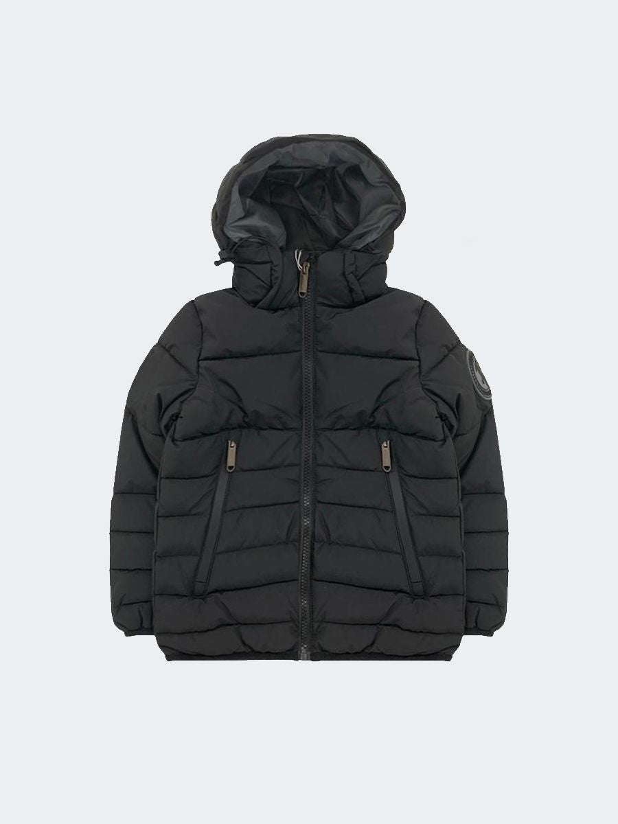 Giubbino trapuntato full Zip con Cappuccio con chiusura a contrasto colore.Patch Logo sulla manica