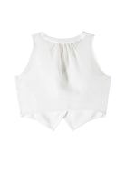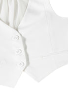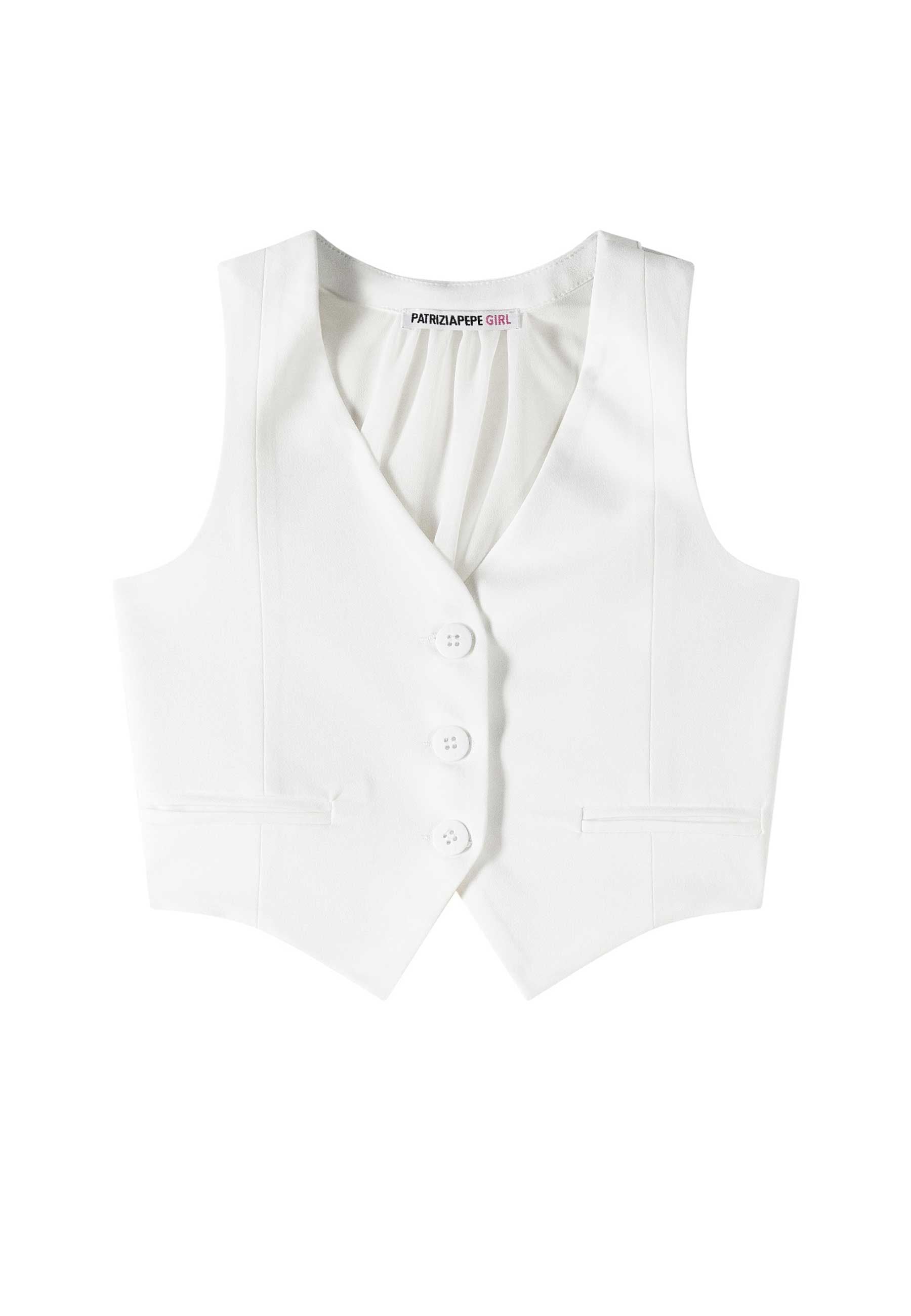 Gilet Essential Patrizia Pepe in raffinata miscela di viscosa e cotone colore disponibile bianco e nero elegante e versatile capo leggero traspirante piacevole al tatto pensato per uno stile curato moderno e ricercato linea femminile essenziale con scollo a giacca e revers che valorizzano la figura dettaglio a quattro bottoni. etichetta logo sul retro e originale cut out sul dietro che dona carattere contemporaneo e personalità design italiano con origine Firenze espressione di qualità cura sartoriale e gusto senza tempo capo esclusivo distribuito da Bimbivip partner storico affidabile e riconosciuto nel panorama europeo ecommerce e retail punto di riferimento per le famiglie che cercano autenticità sicurezza e marchi prestigiosi garanzia di acquisto protetto servizio attento e esperienza soddisfacente per ogni cliente