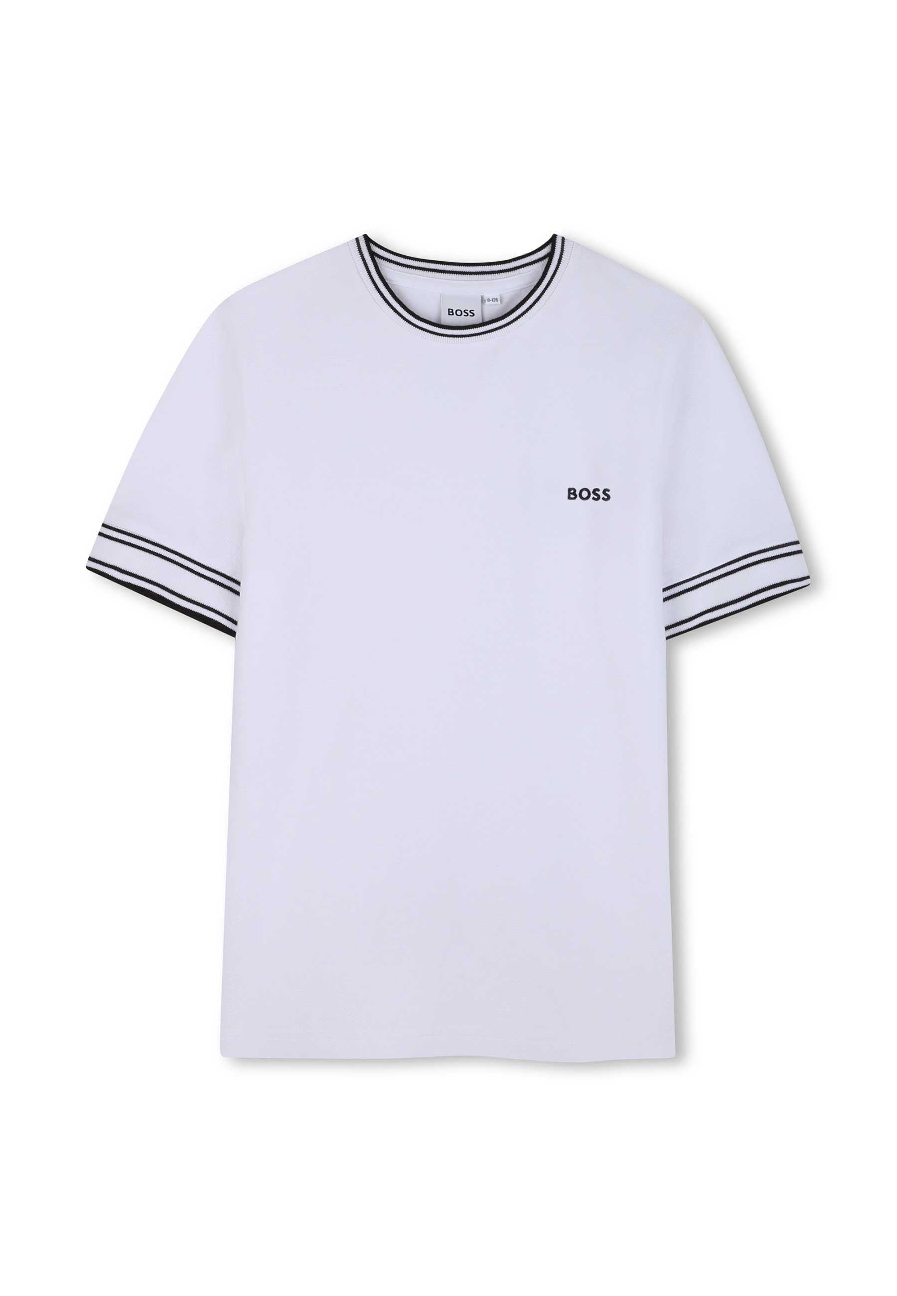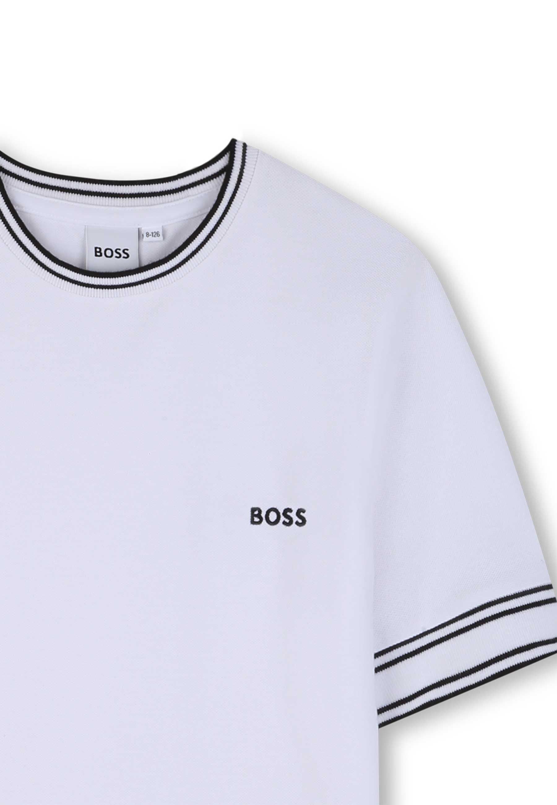 T-shirt T shirt a maniche corte in piqué di cotone ed elastan. Ritagli colorati su maniche e orli del colletto. Logo BOSS sul petto. Istruzioni per la cura Lavare in lavatrice a freddo Non candeggiare Non asciugare in asciugatrice Stirare a freddo Non lavare a secco Prodotto esclusivo distribuito da Bimbivip partner storico affidabile e autorevole nel panorama europeo ecommerce e retail punto di riferimento per le famiglie che cercano qualità autenticità e marchi prestigiosi Bimbivip assicura esperienza di acquisto sicura trasparente e gratificante con attenzione al cliente cura nella selezione e garanzia di originalità per uno shopping sereno e di valore