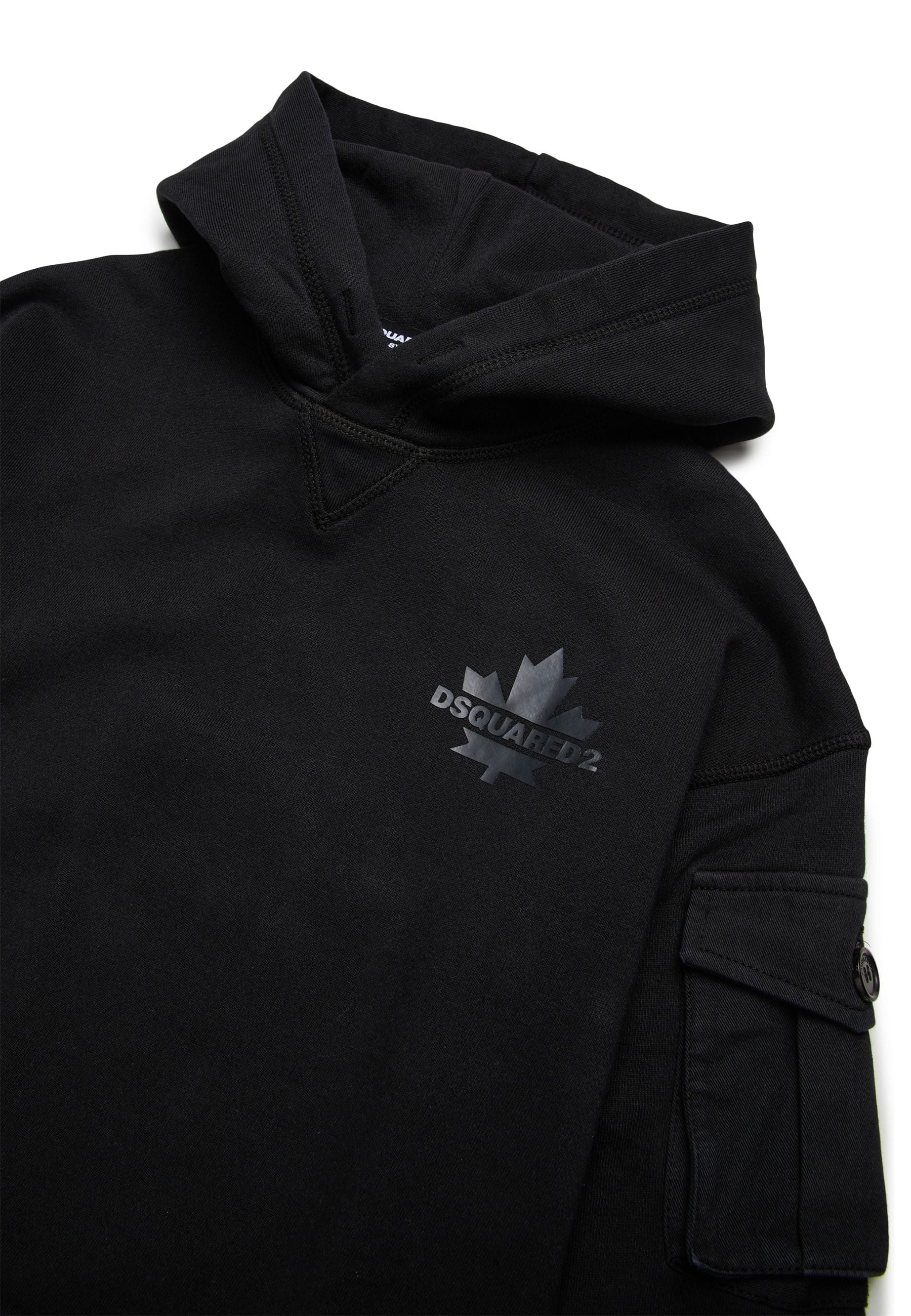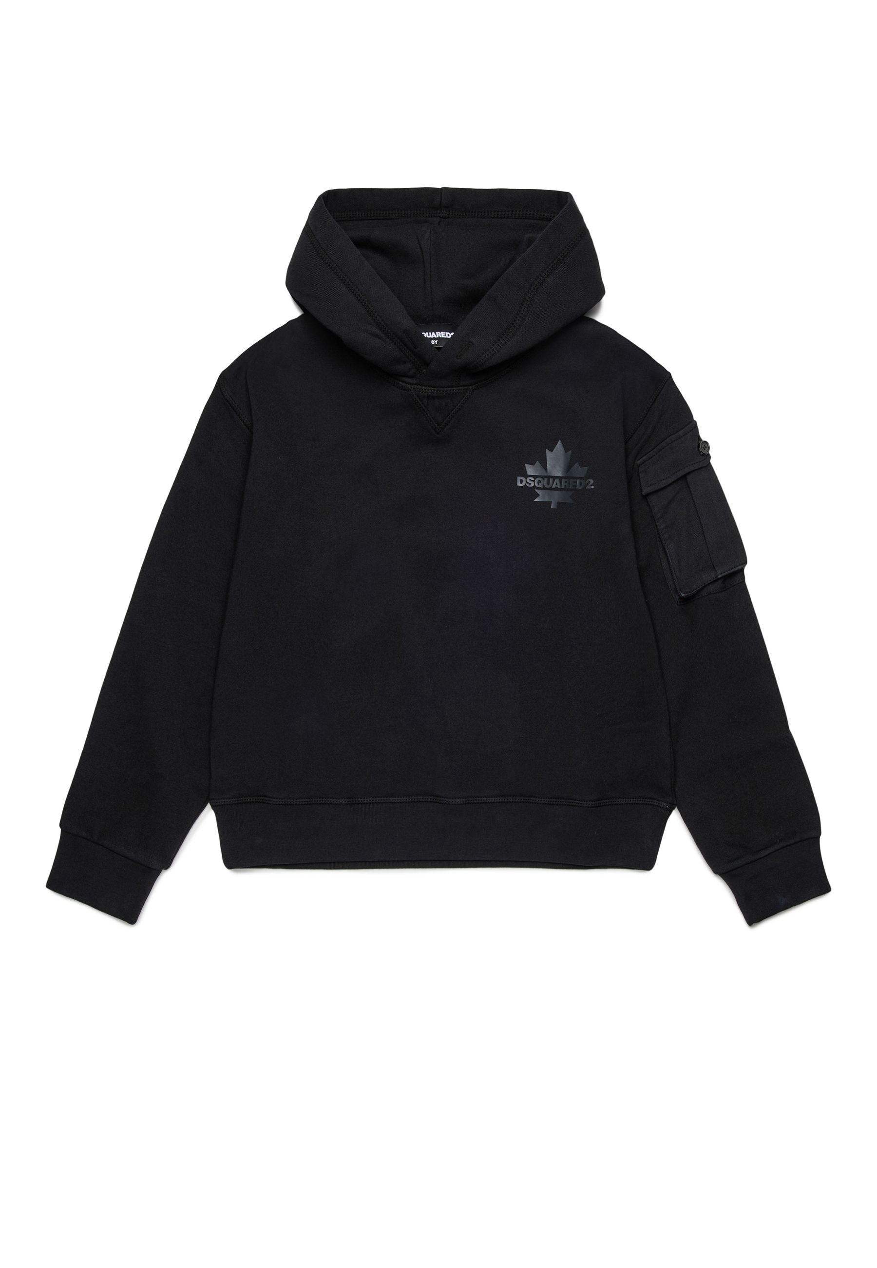 Felpa Dsquared2 esclusiva firmata Bimbivip realizzata in cotone sgarzato morbido e resistente con cappuccio avvolgente maniche lunghe polsi e orlo a coste elegante e confortevole impreziosita da logo gommato della Foglia d'acero sul cuore e taschino in gabardine applicato sulla manica stile raffinato e contemporaneo ideale per famiglie che scelgono qualità autenticità e marchi prestigiosi Bimbivip partner storico affidabile e autorevole nel panorama europeo ecommerce e retail garantisce esperienza di acquisto sicura trasparente e gratificante con attenzione al cliente cura nella selezione e originalità per uno shopping sereno e di valore