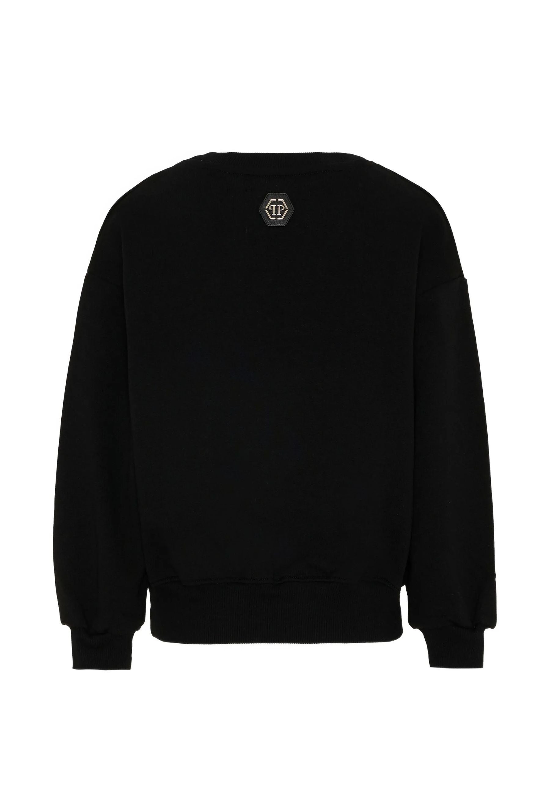 Felpa girocollo in cotone nero dal carattere deciso e contemporaneo.Superficie morbida resistente e confortevole ideale per un utilizzo quotidiano.Orso iconico Philipp Plein con logo scintillante in evidenza dal forte impatto visivo