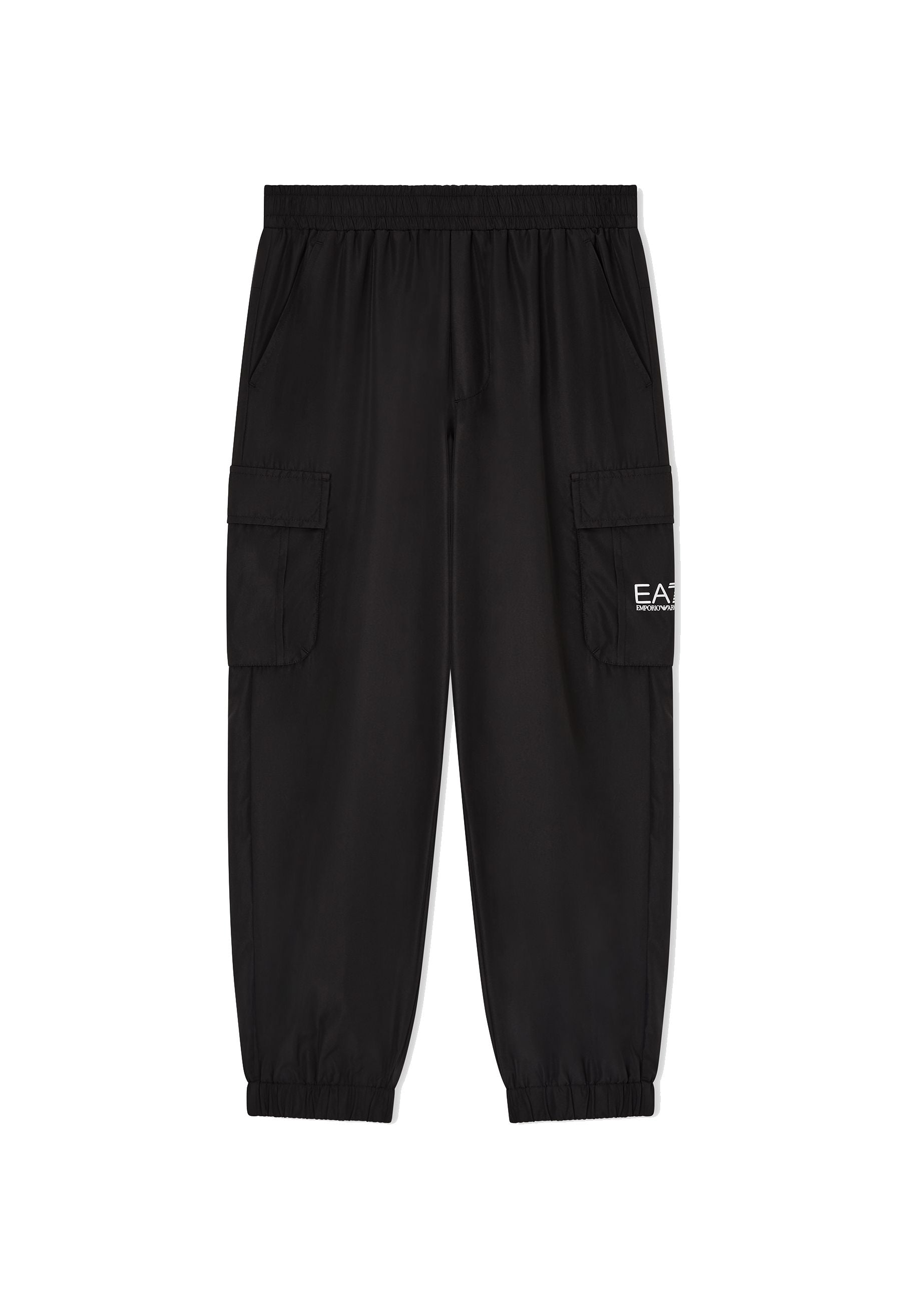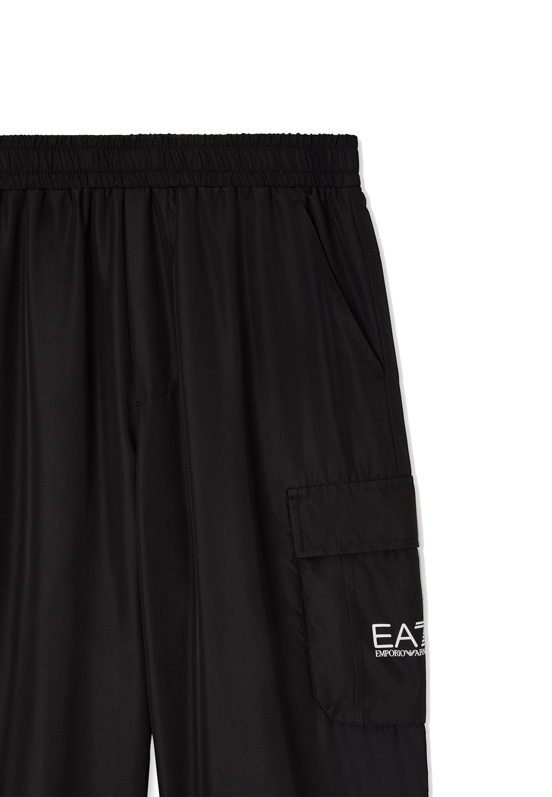 Pantalone EA7 Emporio Armani colore nero realizzati in poliestere modello cargo con tasconi laterali elastico in vita e stampa logo su tasca sinistra un capo esclusivo distribuito da Bimbivip partner storico affidabile e riconosciuto nel panorama europeo dell’e-commerce e retail punto di riferimento per le famiglie alla ricerca di qualità originalità e garanzia di marchi prestigiosi per un’esperienza d’acquisto sicura soddisfacente e appagante