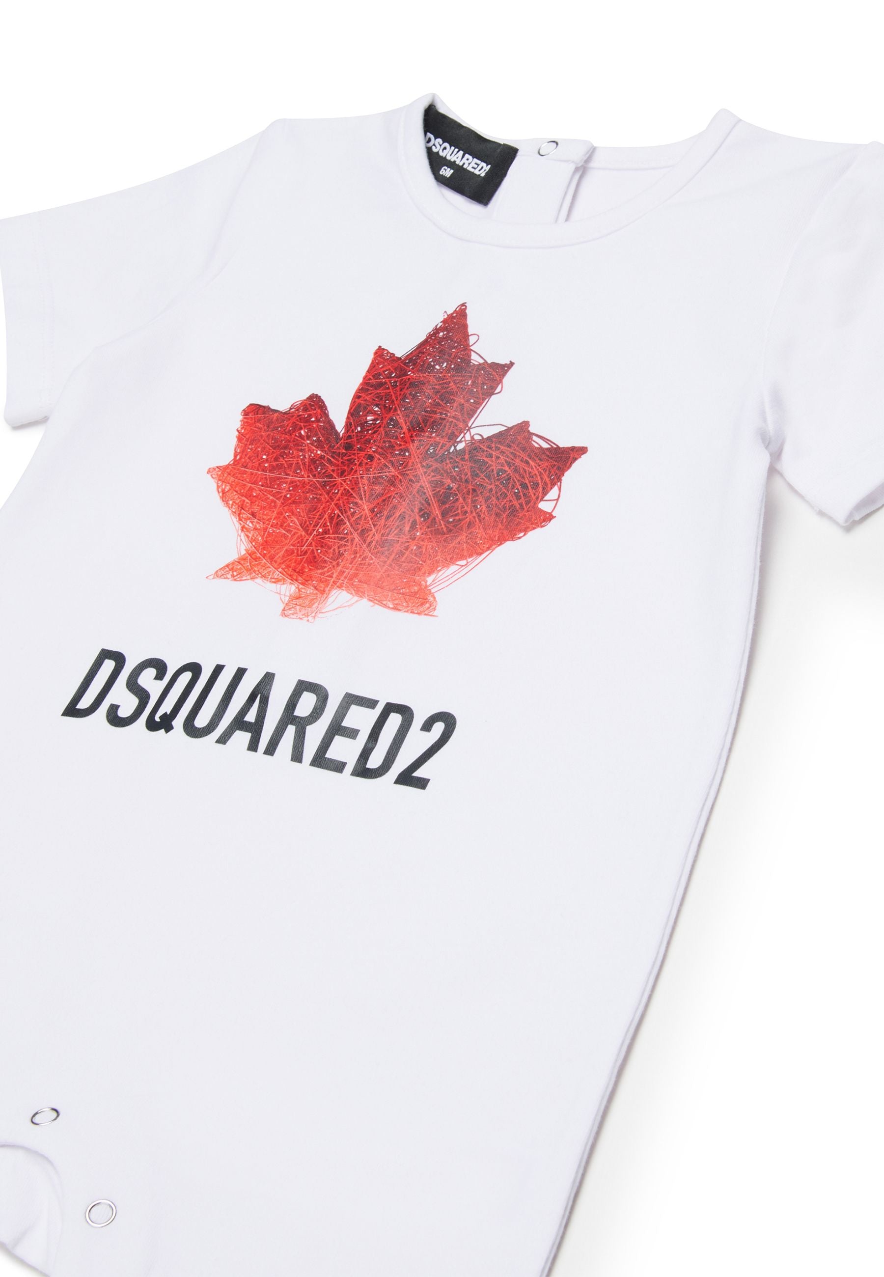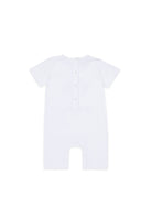 Tutina bianca in misto cotone elasticizzato a maniche corte con girocollo bottoni a cip sul retro e tra le gambe. È decorata con stampa logo e foglia d'acero sulla parte anteriore.