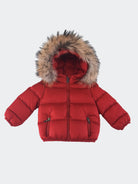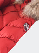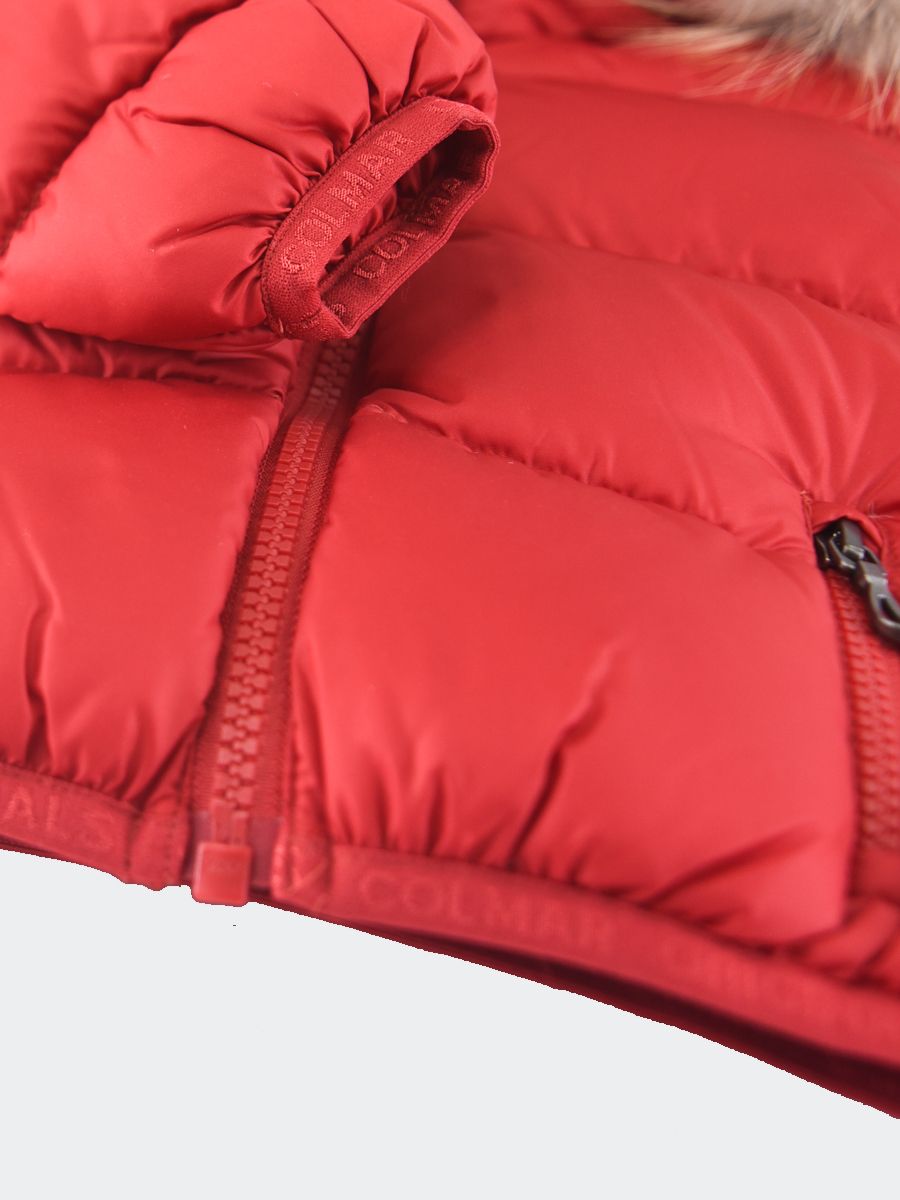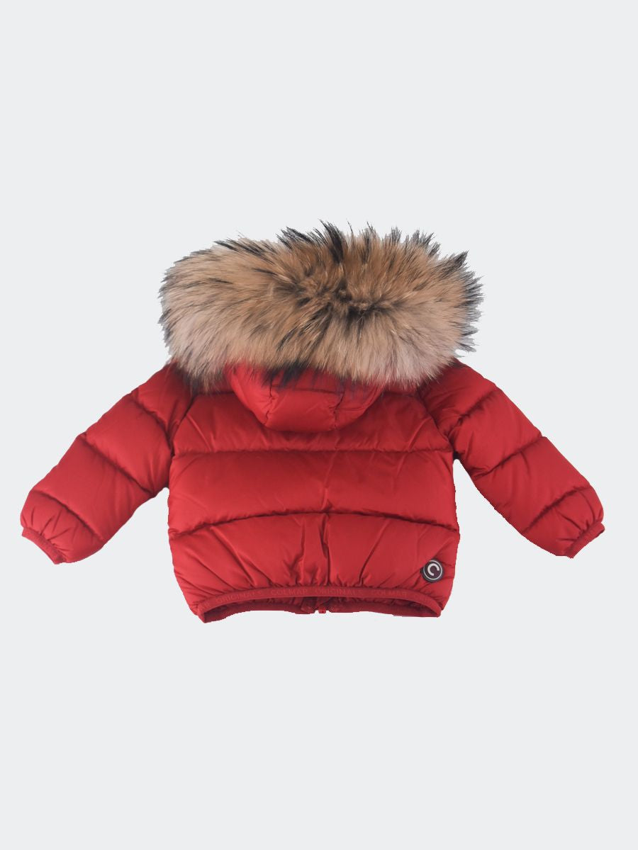 Piumino da neonato con cappuccio e bordo staccabile in vera pelliccia. Idrorepellente e 100% riciclato. Polsini fondo e cappuccio con nastro elastico abbinato come fodera interna Tasche laterali vestibilità regolare e imbottita in piuma naturale. Patch Colmar sulla manica sinistra e patch C sul retro destro