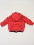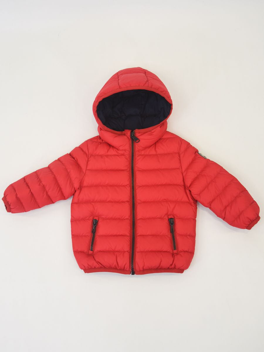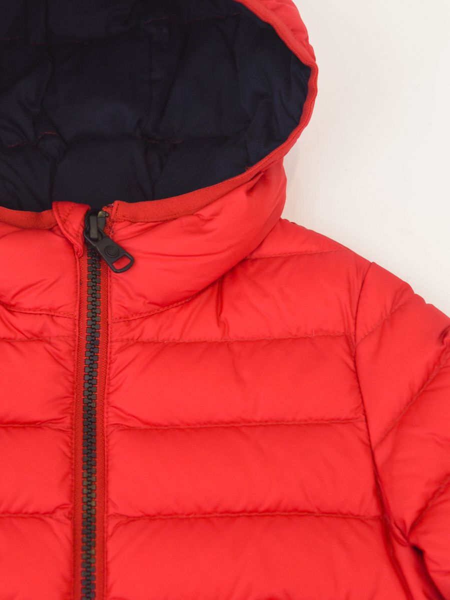 Piumino full Zip con cappuccio fisso. Lampo personalizzata. Tasche esterne. Interno in Piuma con patch logo sulla spalla. Nastro elastico in tinta su cappuccio polsi e fondo