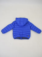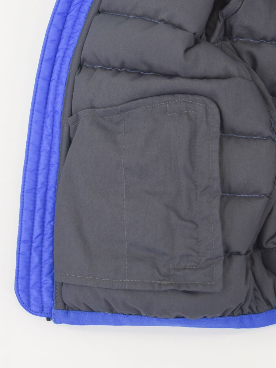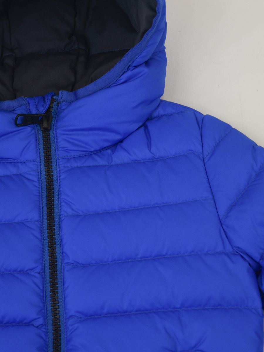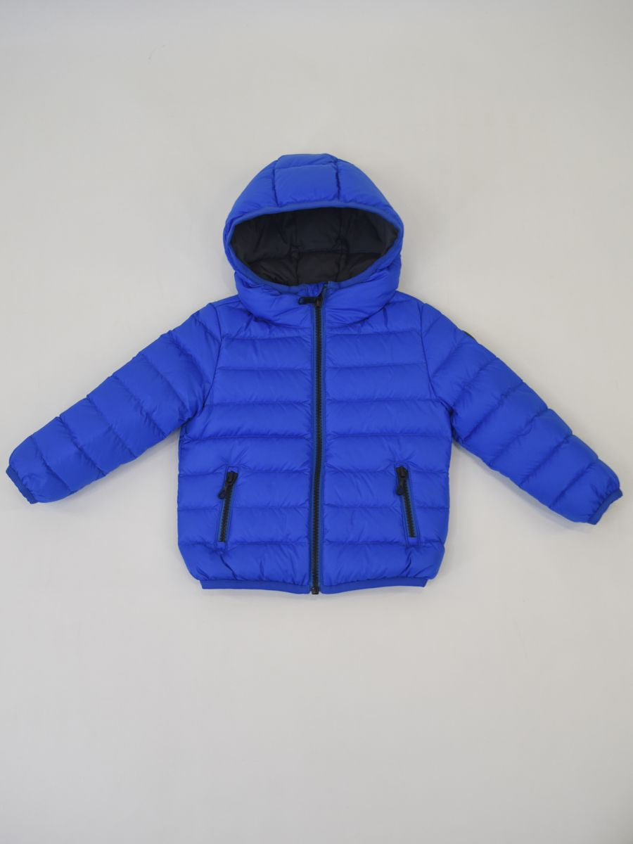 Piumino full Zip con cappuccio fisso. Lampo personalizzata. Tasche esterne. Interno in Piuma con patch logo sulla spalla. Nastro elastico in tinta su cappuccio polsi e fondo