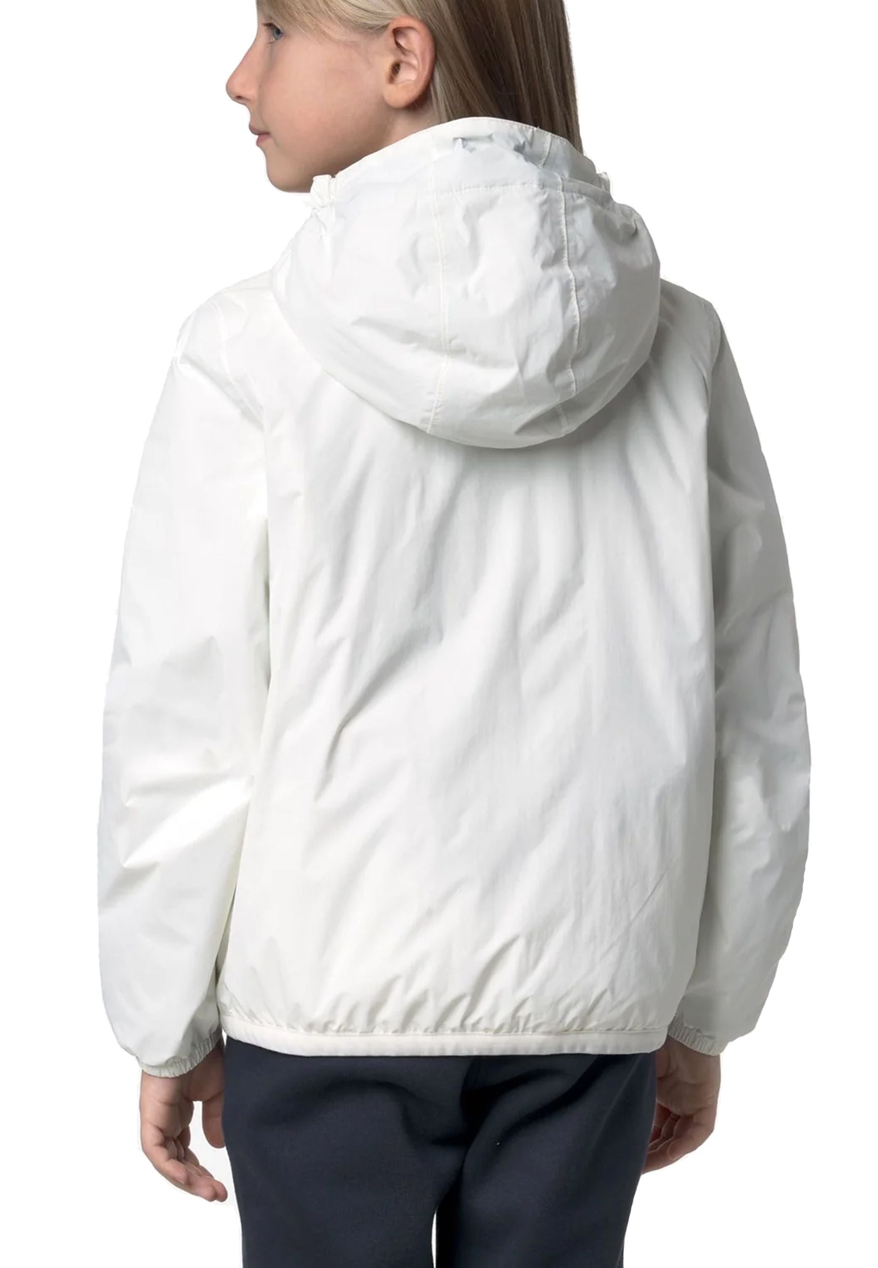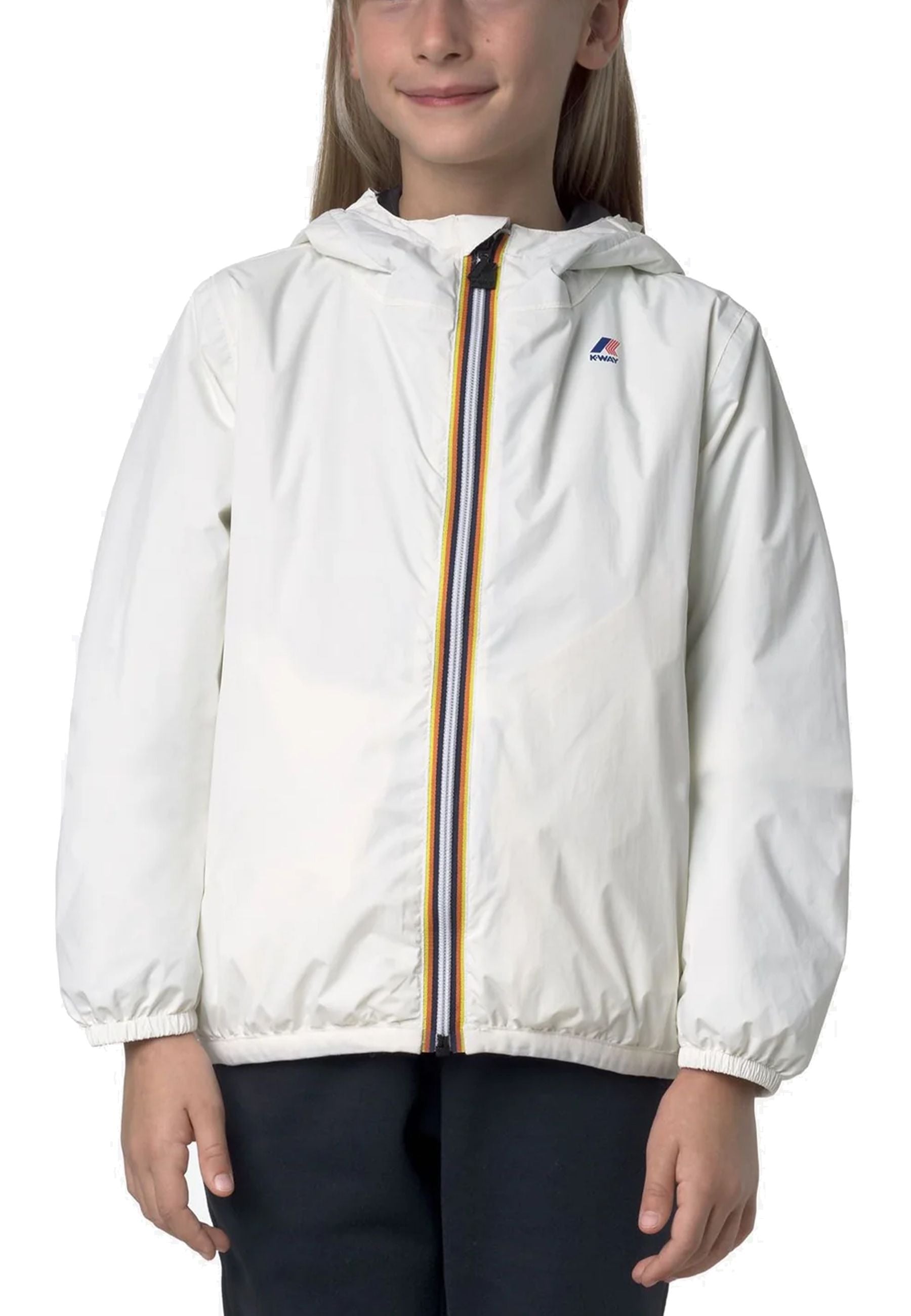 Giubbino corta iconica unisex leggera compatta ingegnosa simbolo dello stile pratico e vivace firmato K-Way pensata per bambini dinamici e curiosi realizzata in tessuto tecnico micro ripstop 4.0 innovativo robusto sostenibile interamente riciclato offre un'impermeabilità eccellente e una traspirazione bilanciata grazie a valori tecnici elevati che raggiungono 10000 mm e 10000 g al metro quadro in ventiquattro ore una vera barriera protettiva contro intemperie e umidità