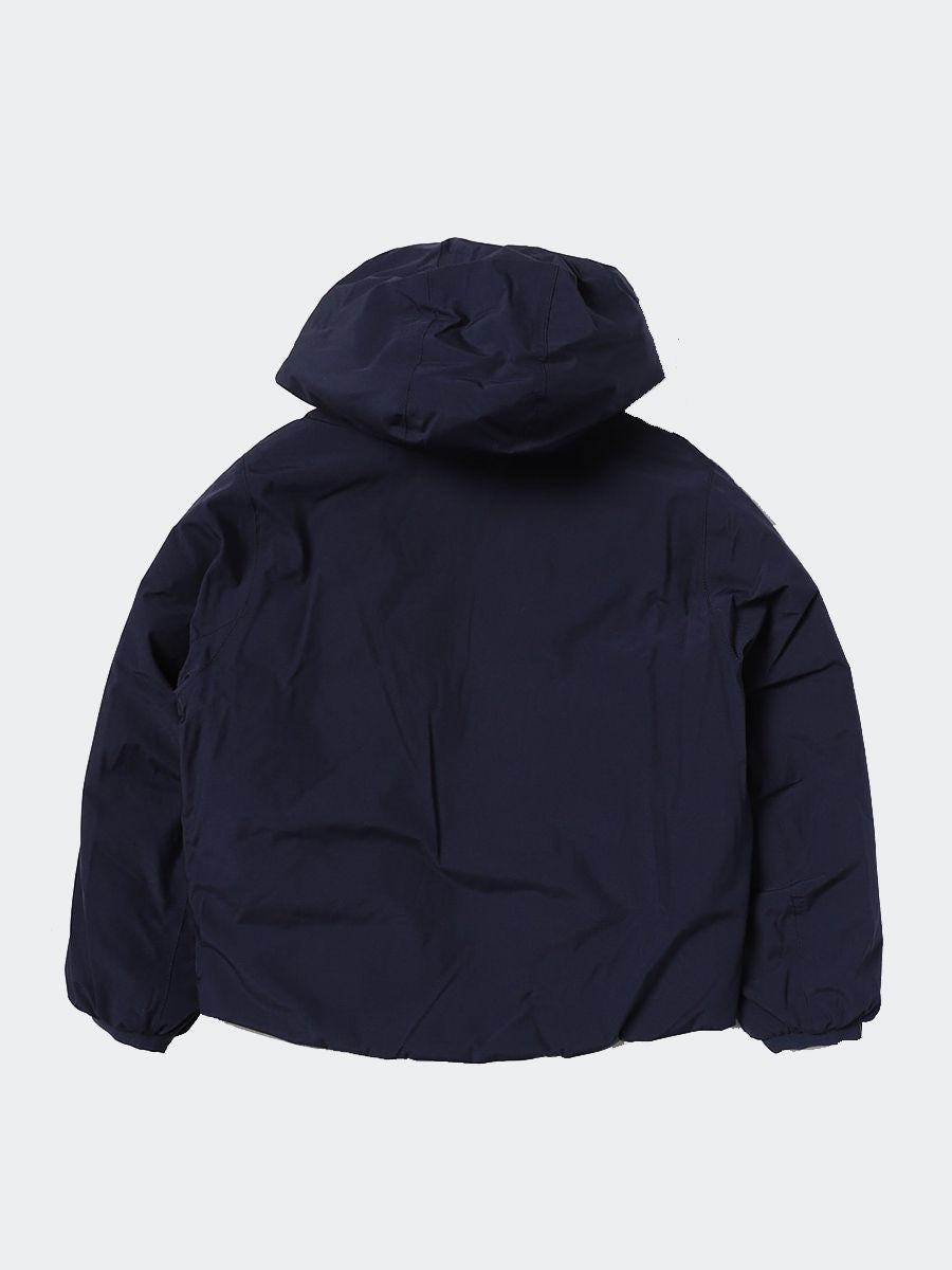 Piumino corto reversibile. Un lato in tessuto nylon elasticizzato impermeabile, idrorepellente, antivento. L'altro lato in tessuto nylon elasticizzato idrorepellente trapuntato a quadretti. Imbottitura in piuma. Grado di calore medio. Cuciture termonastrate. Cappuccio con bordo elastico ripreso sui polsi. Chiusura frontale con zip. Dotato di due tasche frontali con zip su un lato. Altro lato due tasche con bottoni a pressione. Fitting regolare. Logo applicato frontale in silicone bianco lato cuore.
