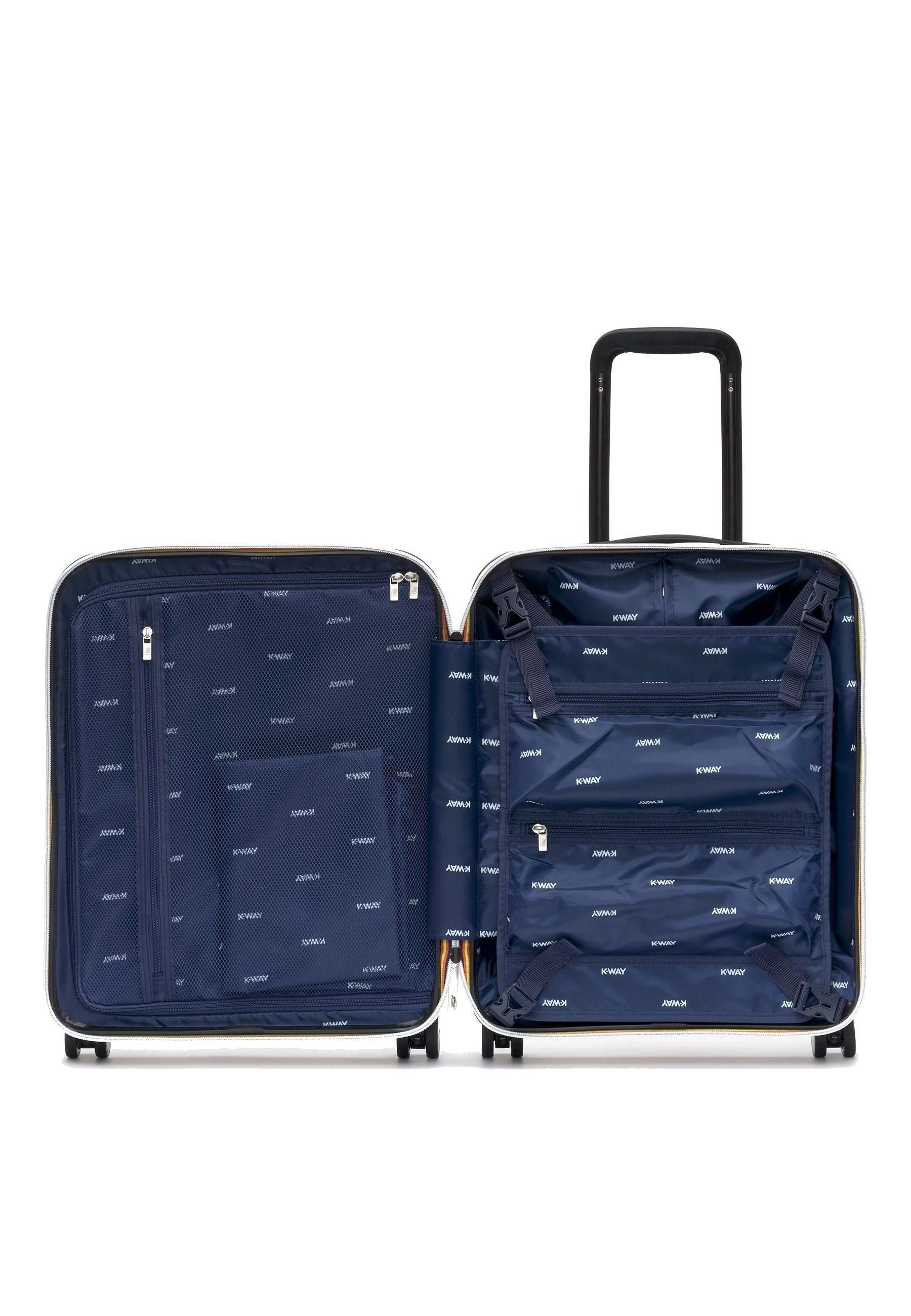 Trolley rigido da viaggio per cabina con doppio cursore con lucchetto e stampa maxi logo K-Way .Quattro ruote pratiche per un facile movimento. La parte interna ha due tasche con zip e chiusura con elastici incrociati. Misure cm 55 altezza cm 40 larghezza 20 cm profondita