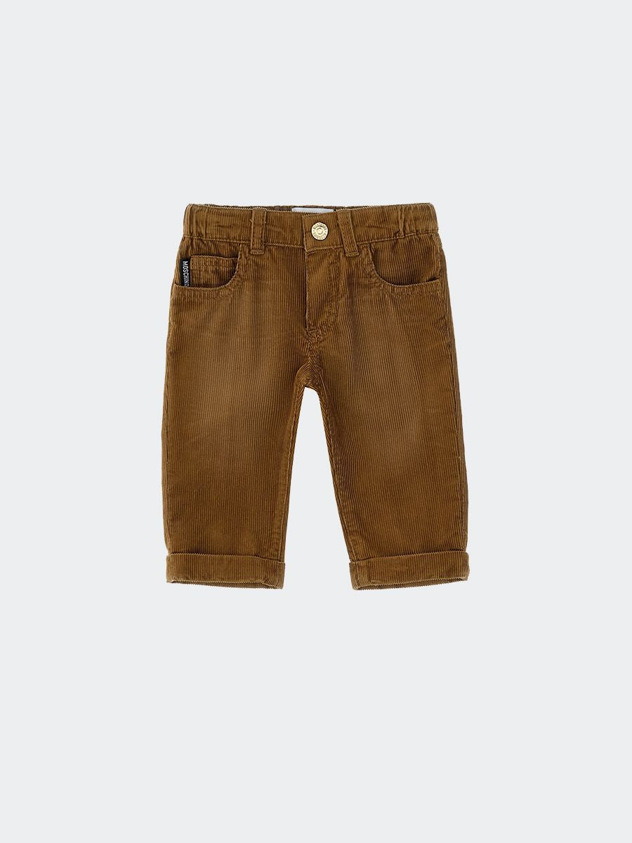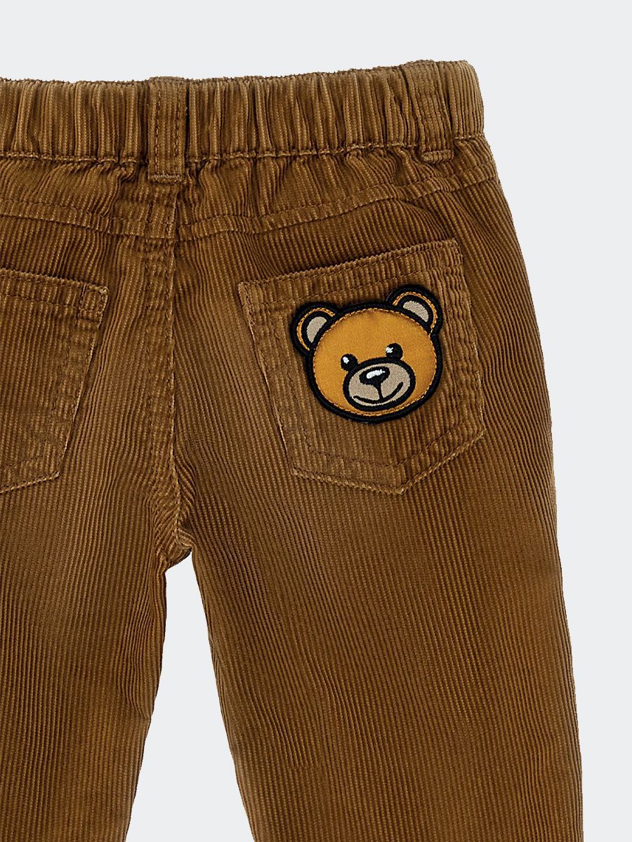 Pantalone da neonato con elastico in vita. Tessuto in velluto con tasca posteriore con patch orsetto