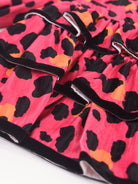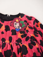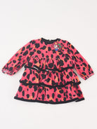 Abito girocollo a manica lunga a fantasia maculata fuxia con voila sul fondo. Bordi in tinta colore nero a contrasto. Polsi con elastici e patch applicato accanto al collo. Apertura a Zip posteriore