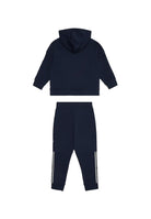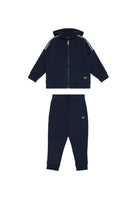 Completo Emporio Armani include un cardigan in felpa e un paio di pantaloni realizzati in tessuto di cotone blu navy. Lungo le maniche e i lati delle gambe dei pantaloni è presente una striscia con il logo blu navy contornato da bianco. Il cardigan sempre di Emporio Armani è dotato di un cappuccio fisso maniche lunghe e ampi orli. Si chiude tramite una cerniera color argento scuro. I pantaloni presentano gambe lunghe con orli elasticizzati stretti mentre in vita sono provvisti di un elastico ampio. Ampie tasche sono posizionate sulla parte anteriore del capo