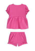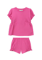 Completo Sportivo composto da t-shirt girocollo manica corta con elastico sulle maniche e cucitura sotto il petto. Ricamo sul fondo e short a palloncino con girovita e fondo con elastico