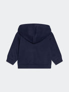 Felpa in cotone felpato bicolore Full zip con cappuccio. Tasca marsupio applicata e Logo stampato sul petto. Polsini e orlo a costine