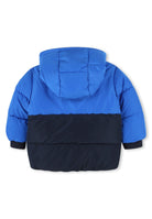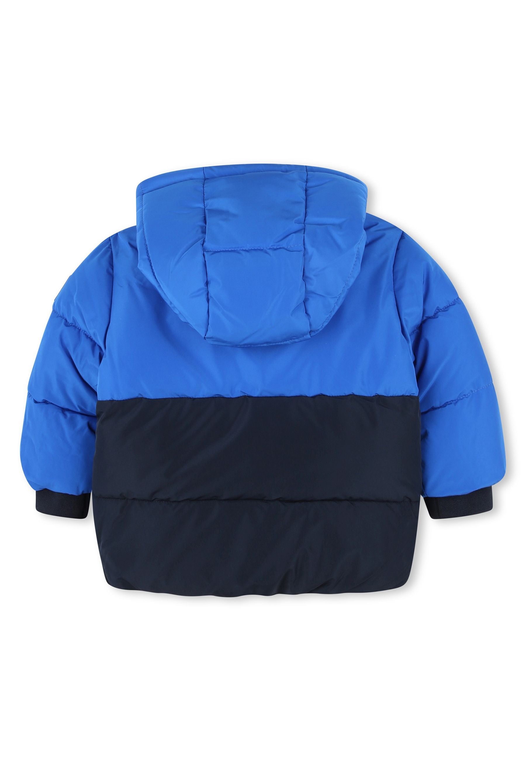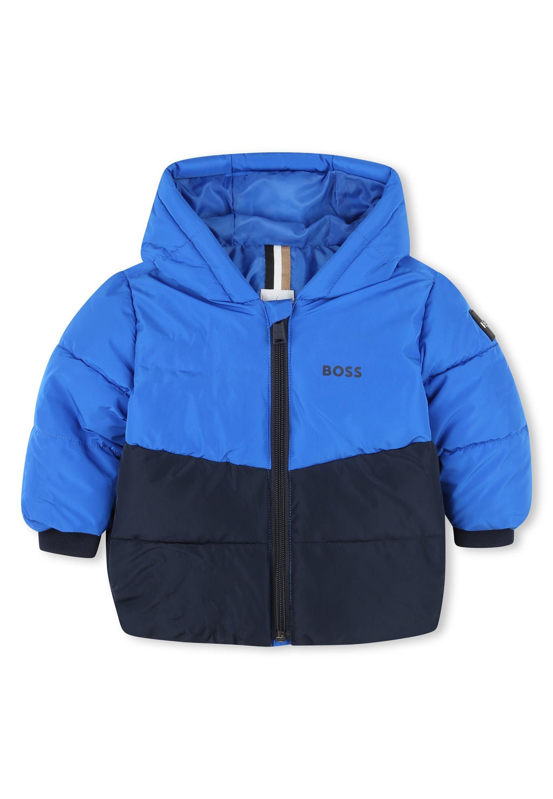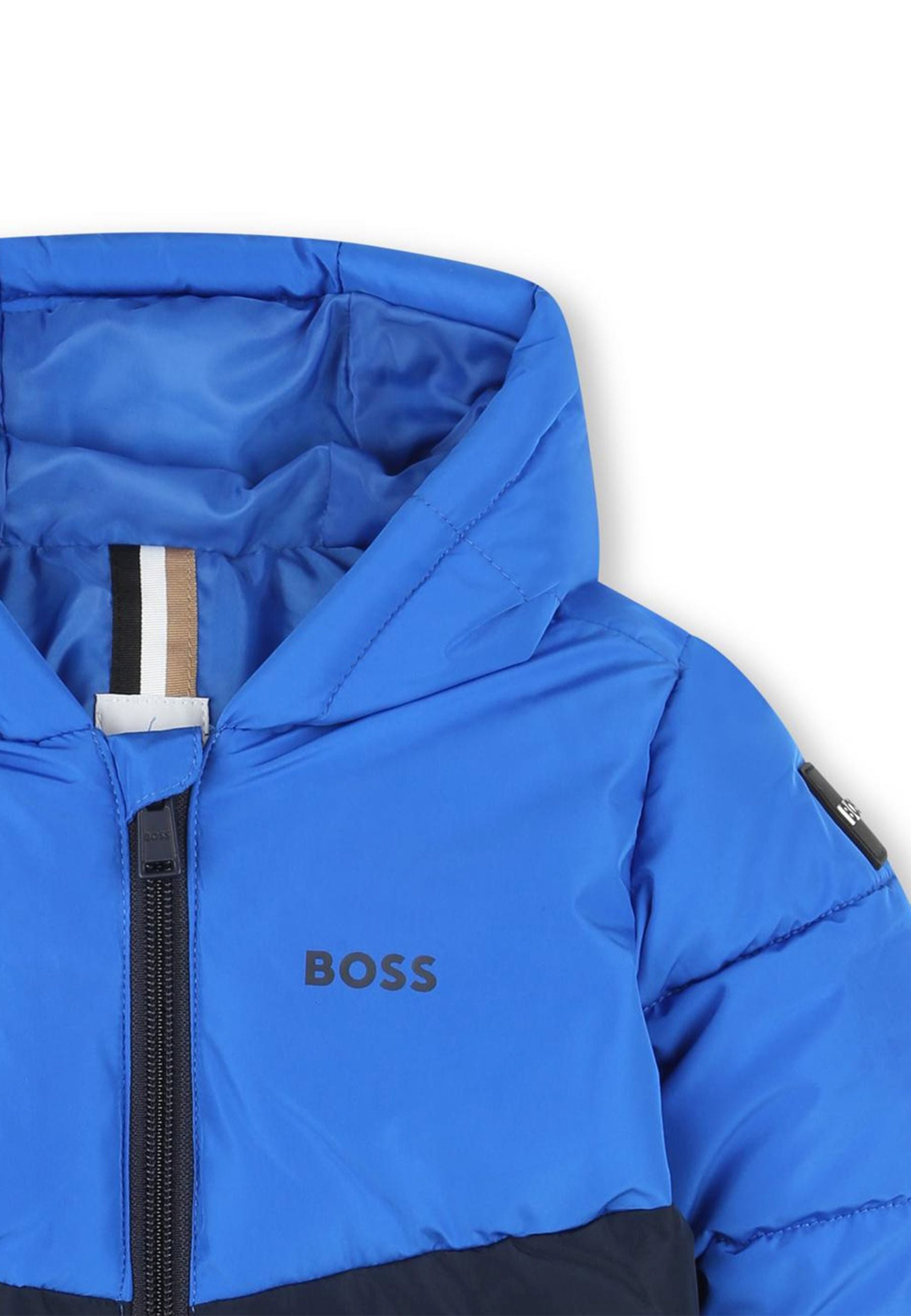 Piumino bicolore con cappuccio realizzato interamente in poliestere e dotato di un'imbottitura in cotone. Questo capo distintivo presenta un badge con il logo sulla spalla e una stampa del logo BOSS sul petto. La chiusura frontale è dotata di una pratica zip combinando eleganza e funzionalità.Bimbivip rinomato e-commerce e negozio di prestigio che opera in tutta Europa vanta una lunga storia di eccellenza e partnership con marchi di alta qualità per garantire la completa soddisfazione dei clienti
