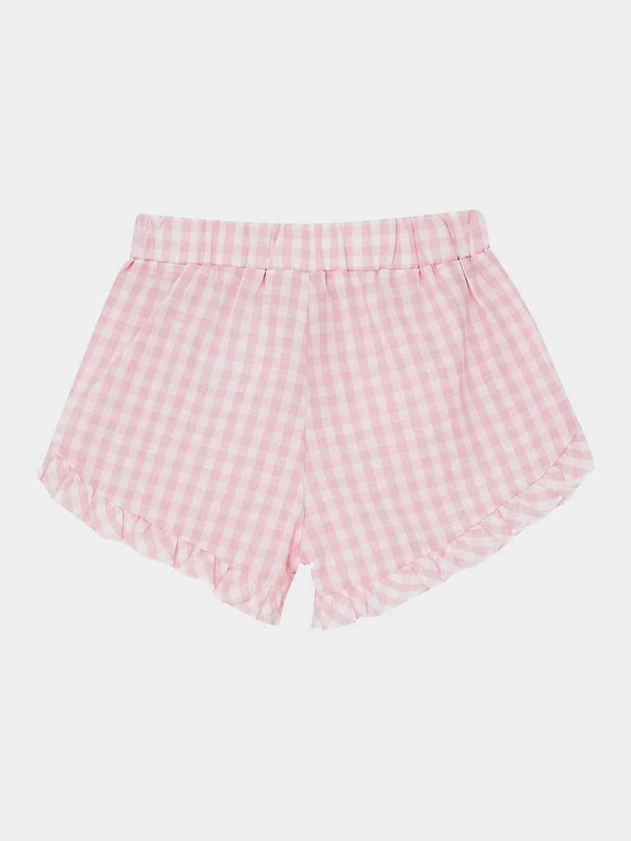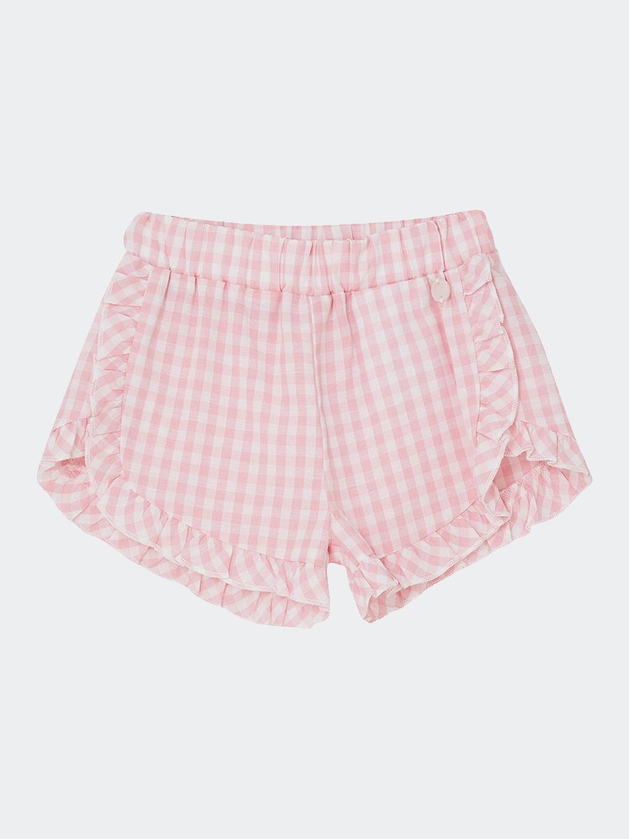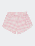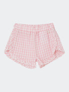 Shorts a fantasia quadrettata con voilà sul fondo e laterali. Placchetta logo cucita. Girovita regolabile