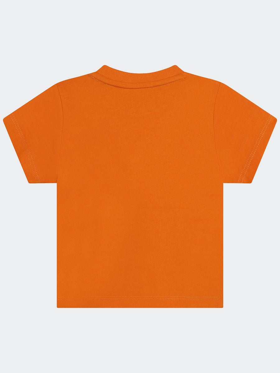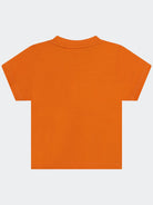 T-shirt girocollo a manica corta tinta unita con stampa centrale e bottoni a pressione sulla spalla. Orlo dritto