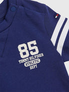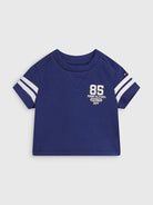 T-shirt girocollo manica corta con stampa frontale e posteriore a tema College.Chiusura con bottoni automatici sulla spalla. Righe a contrasto sulle maniche