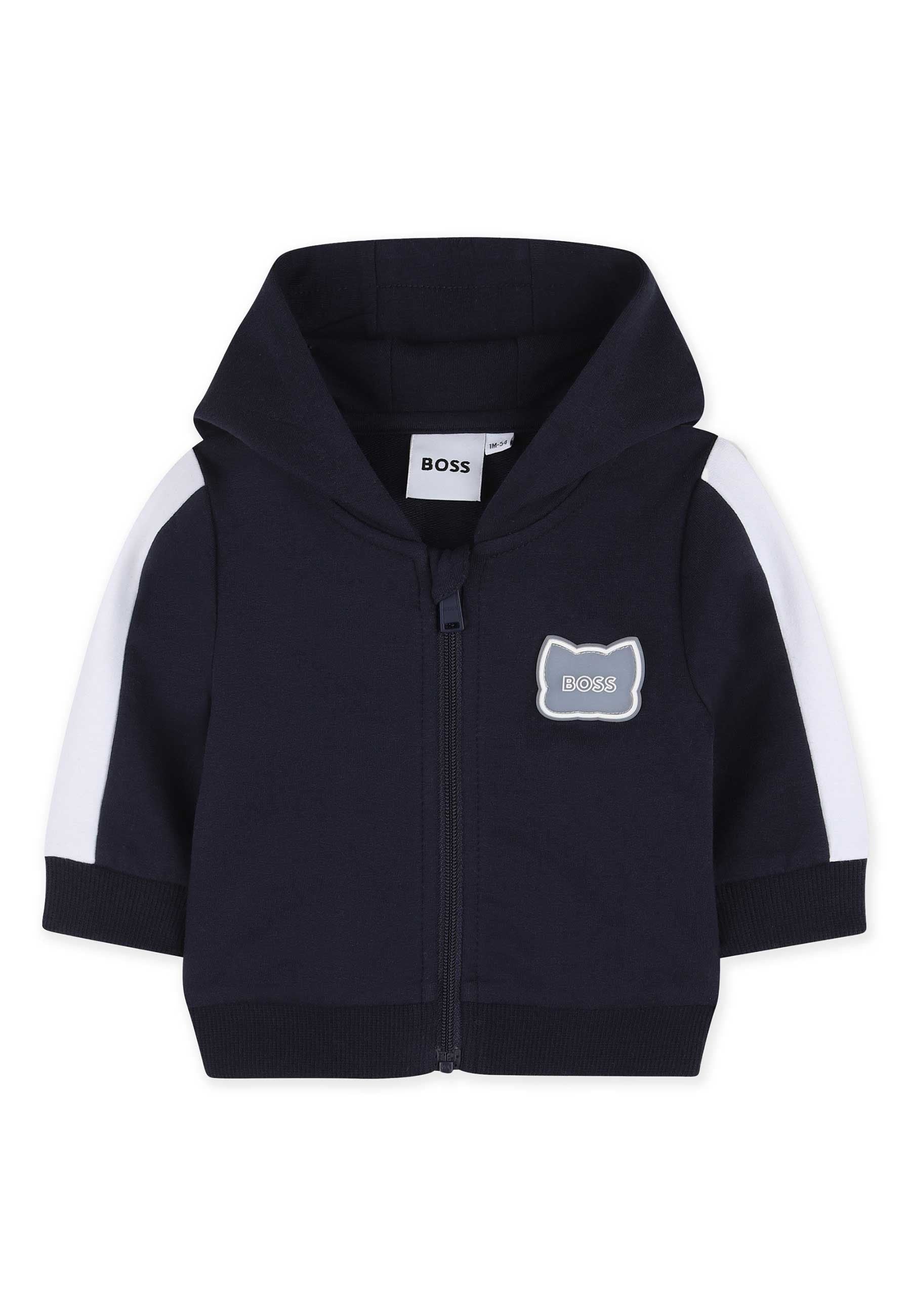 Completo Sportivo Completo cardigan pantaloni e t shirt. Cardigan con cappuccio in pile di cotone ed elastan chiusura con zip sul davanti aperture sulle maniche stemma gommato a forma di testa di panda rosso sul petto. Pantaloni in pile di cotone ed elastan elastico in vita aperture sui fianchi logo BOSS stampato sul fondo gamba. T shirt in jersey 100% cotone chiusura con bottone automatico sulla spalla logo BOSS stampato sul davanti. VENDUTO IN CONFEZIONE REGALO Istruzioni per la cura Lavare in lavatrice a freddo Non candeggiare Non asciugare in asciugatrice Stirare a freddo Non lavare a secco Prodotto esclusivo distribuito da Bimbivip partner storico affidabile e autorevole nel panorama europeo ecommerce e retail punto di riferimento per le famiglie che cercano qualità autenticità e marchi prestigiosi Bimbivip assicura esperienza di acquisto sicura trasparente e gratificante con attenzione al cliente cura nella selezione e garanzia di originalità per uno shopping sereno e di valore Seguire attentamente le istruzioni di lavaggio riportate sull'etichetta all'interno del capo. made in CINA composizione 95% COTTON 5% ELASTANE - TRIMMING: 95% COTTON 5% ELASTANE - LINING: 100% COTTON