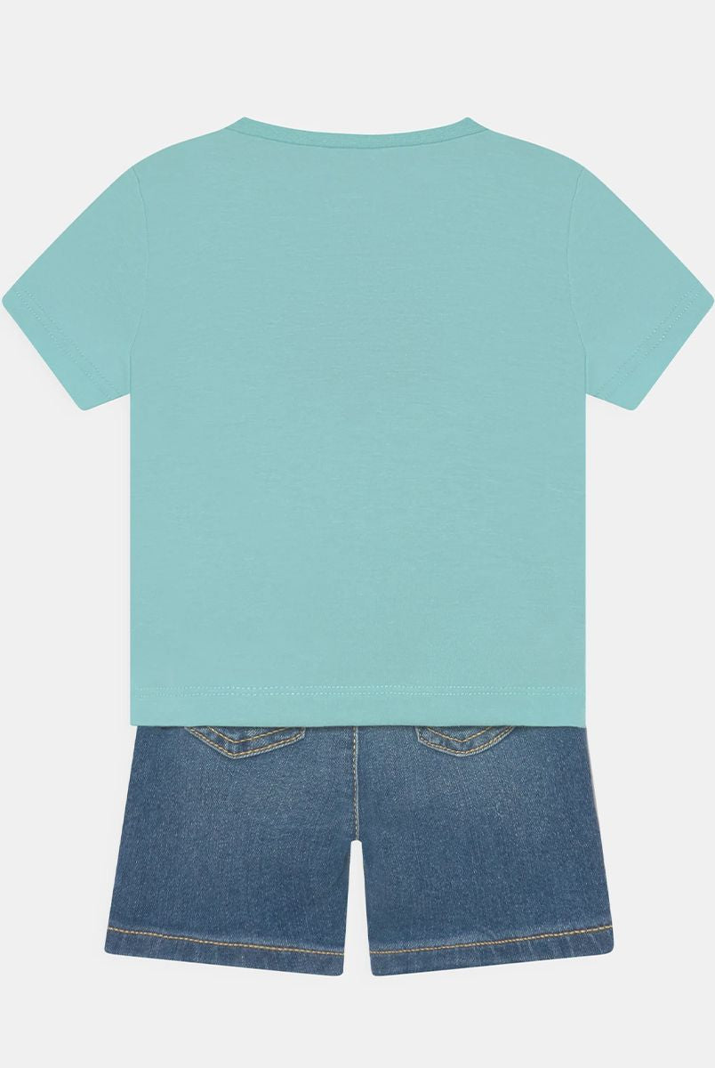 Completo Sportivo t-shirt girocollo manica corta con Stampa Logo frontale e Bermuda in denim elasticizzato