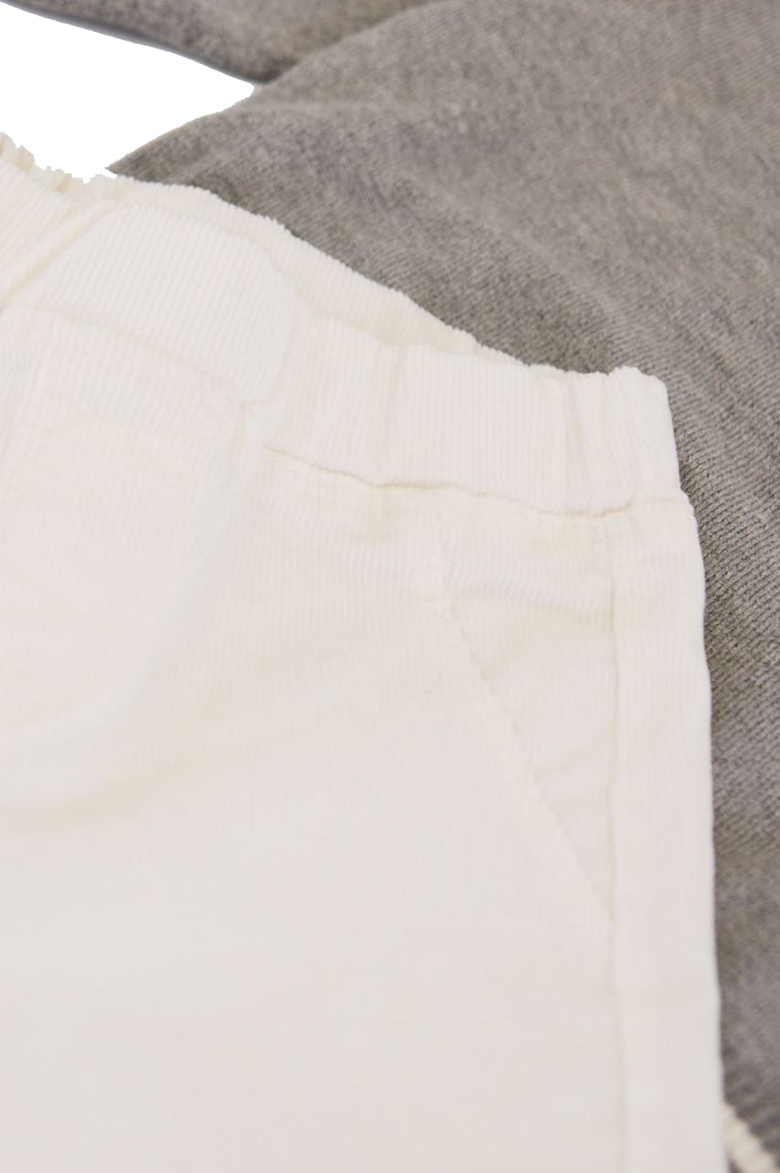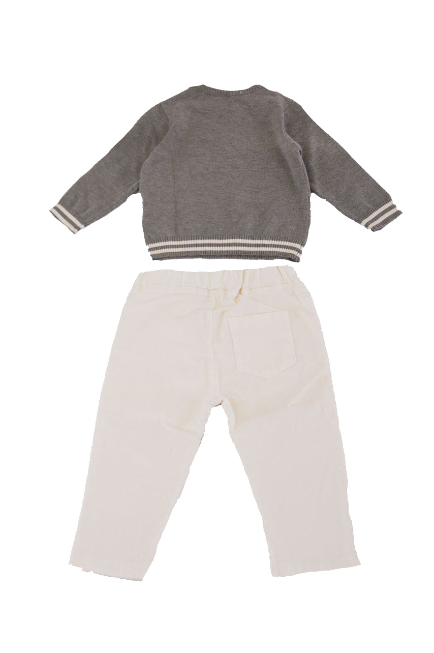 Completo Sportivo composto da maglia e pantalone. Girocollo in viscosa manica lunga con Ricamo frontale sul fondo. Bottoni sulla spalla. Costina su Fondo e polsi. Pantalone in velluto tinta unita con girovita elastico