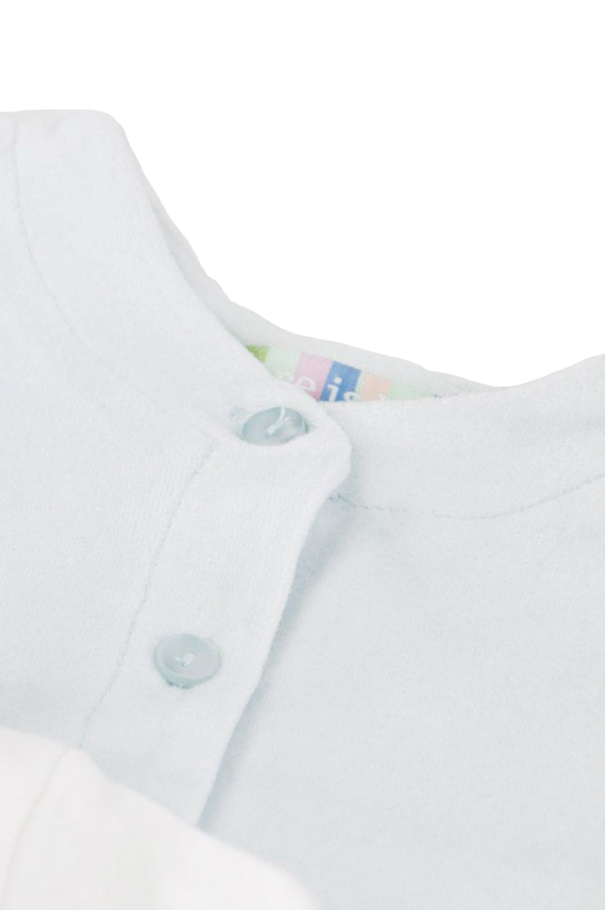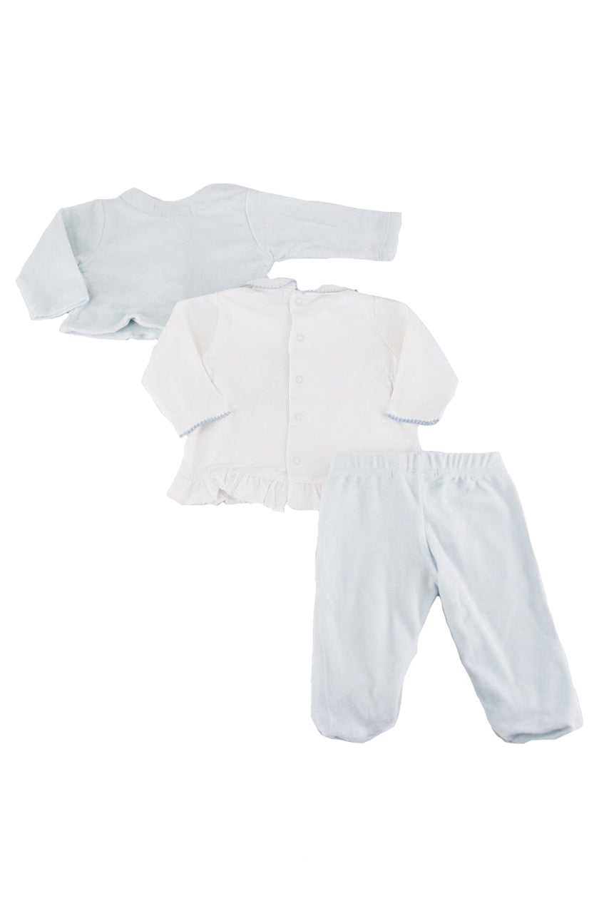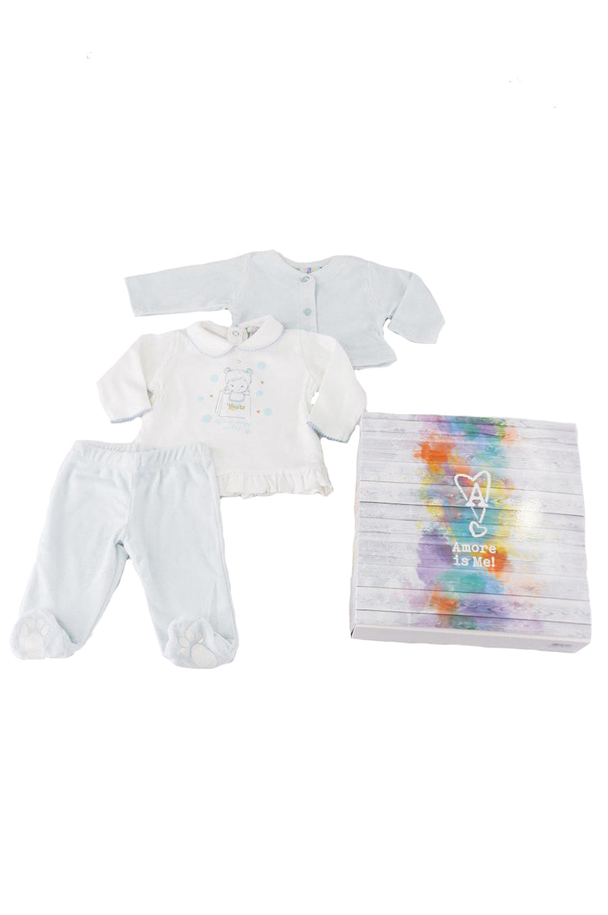 Completo composto da maglia manica lunga con Collo e stampa frontale. Giacchino tinta unita con apertura a Bottoni frontali e pantalone con piedini. Confezione regalo a cassetto inclusa