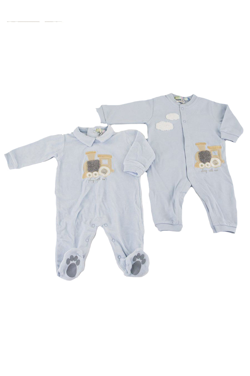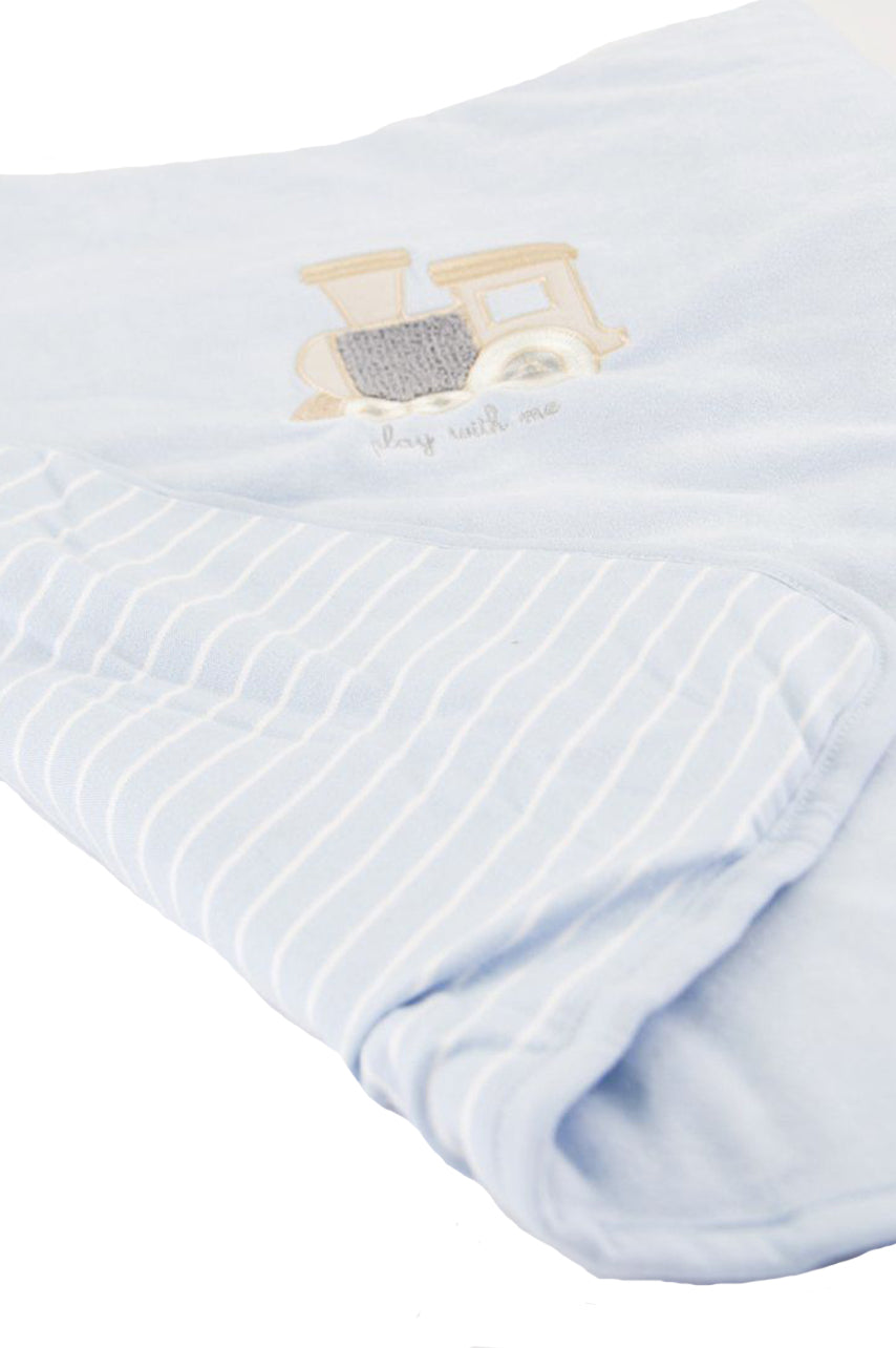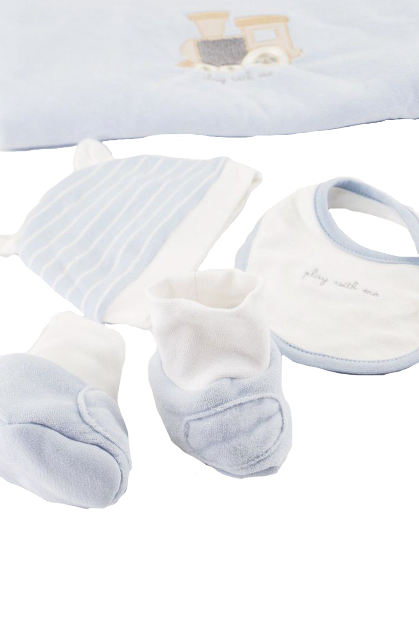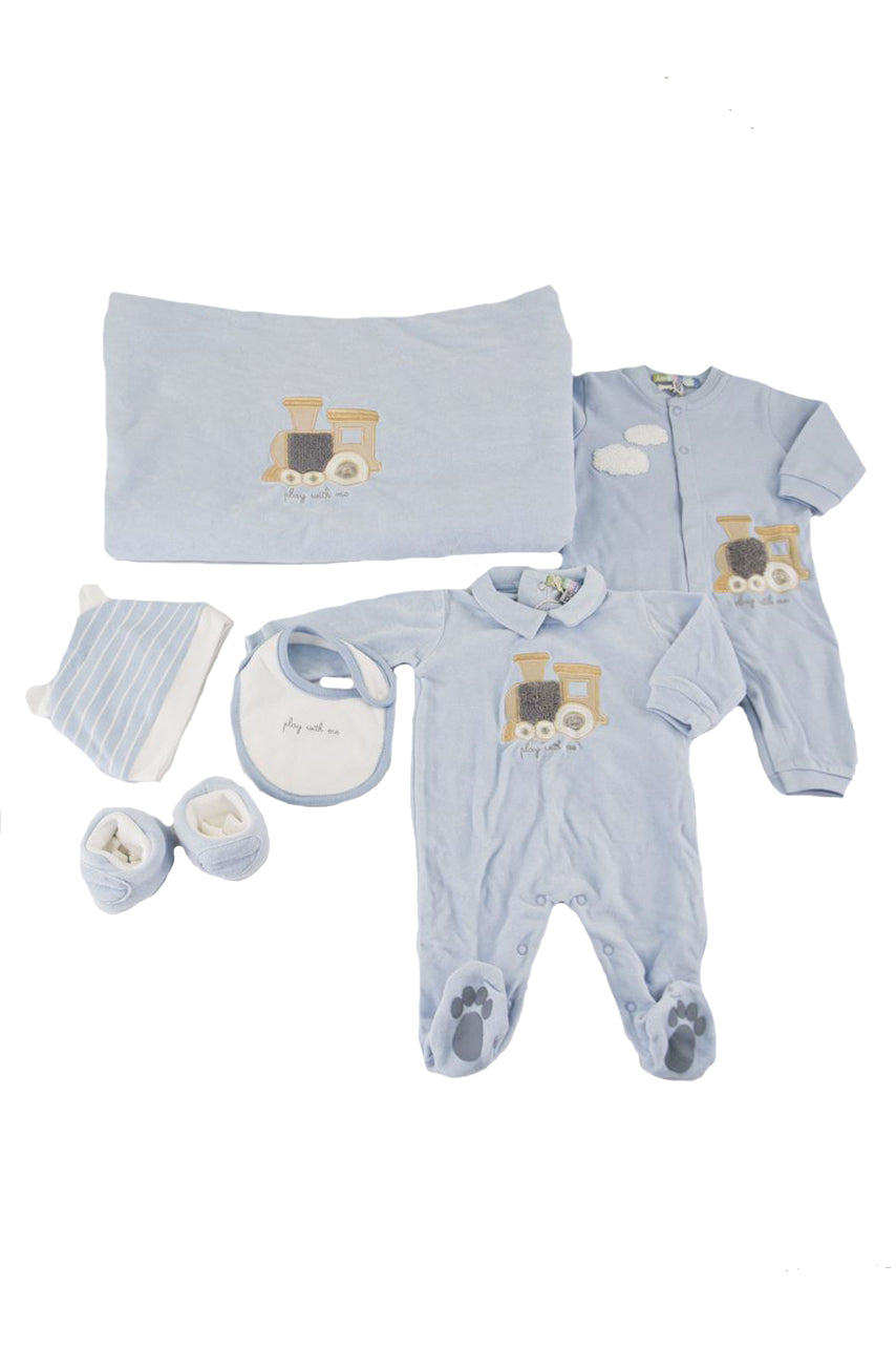 Set Regalo composto da 2 tutine a tema trenino. Coperta Ricamata. Cappellino Babbucce e bavaglino idea regalo unica