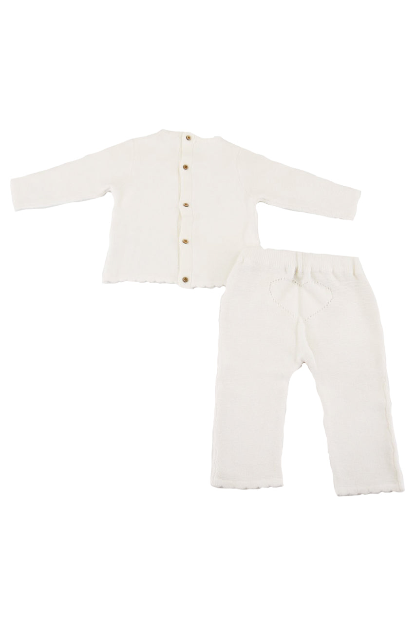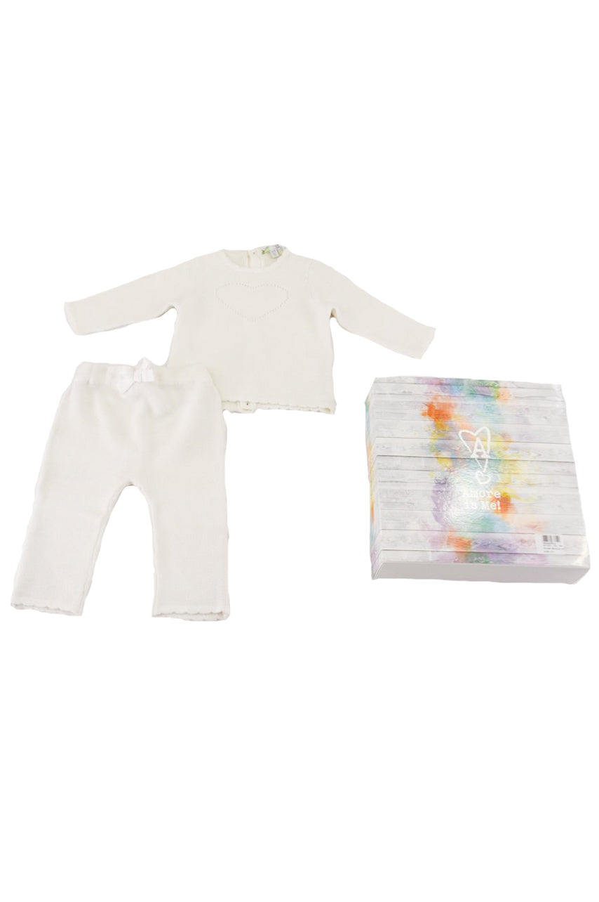 Completo composto da maglia e ghettina lavorata con Tema Cuore. La maglia aperta nella parte posteriore a bottoni.Confezione regalo a cassetto inclusa