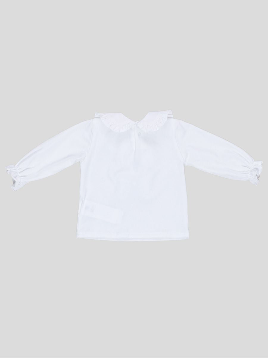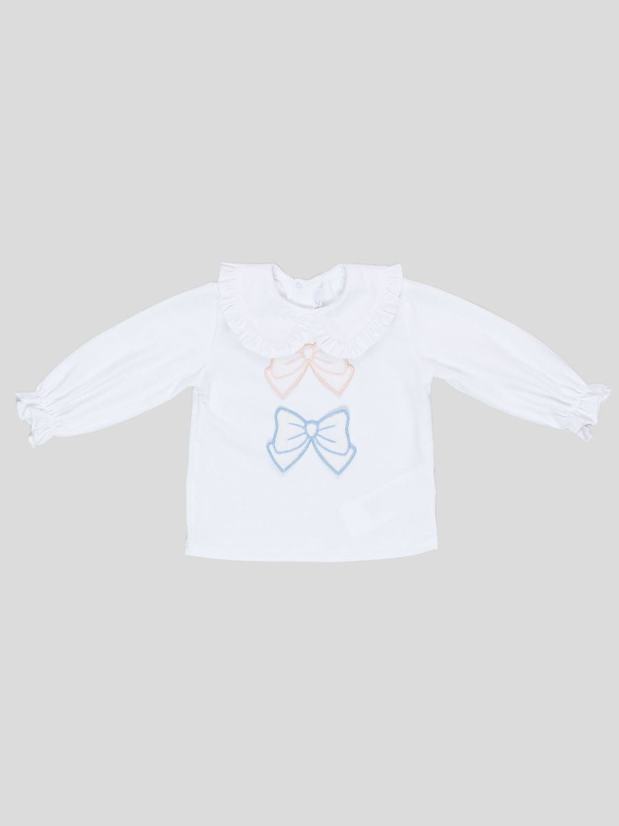 T-shirt con collo largo con decori rouge. In cotone popeline a manica lunga tinta unita. Applicazioni di 2 fiocchi centrali. Polsi con elastico.Bottoni a pressione fino alla taglia 2 posteriore per facilitare la vestibilita Capo preferibilmente utilizzabile nelle stagioni primaverili e autunnali LAVARE A 30° IN LAVATRICE - NON STIRARE - NON LAVABILE CON I COLORI CHIARI - NON USARE CANDEGGINA made in ITALIA composizione 92%CO 8%EA