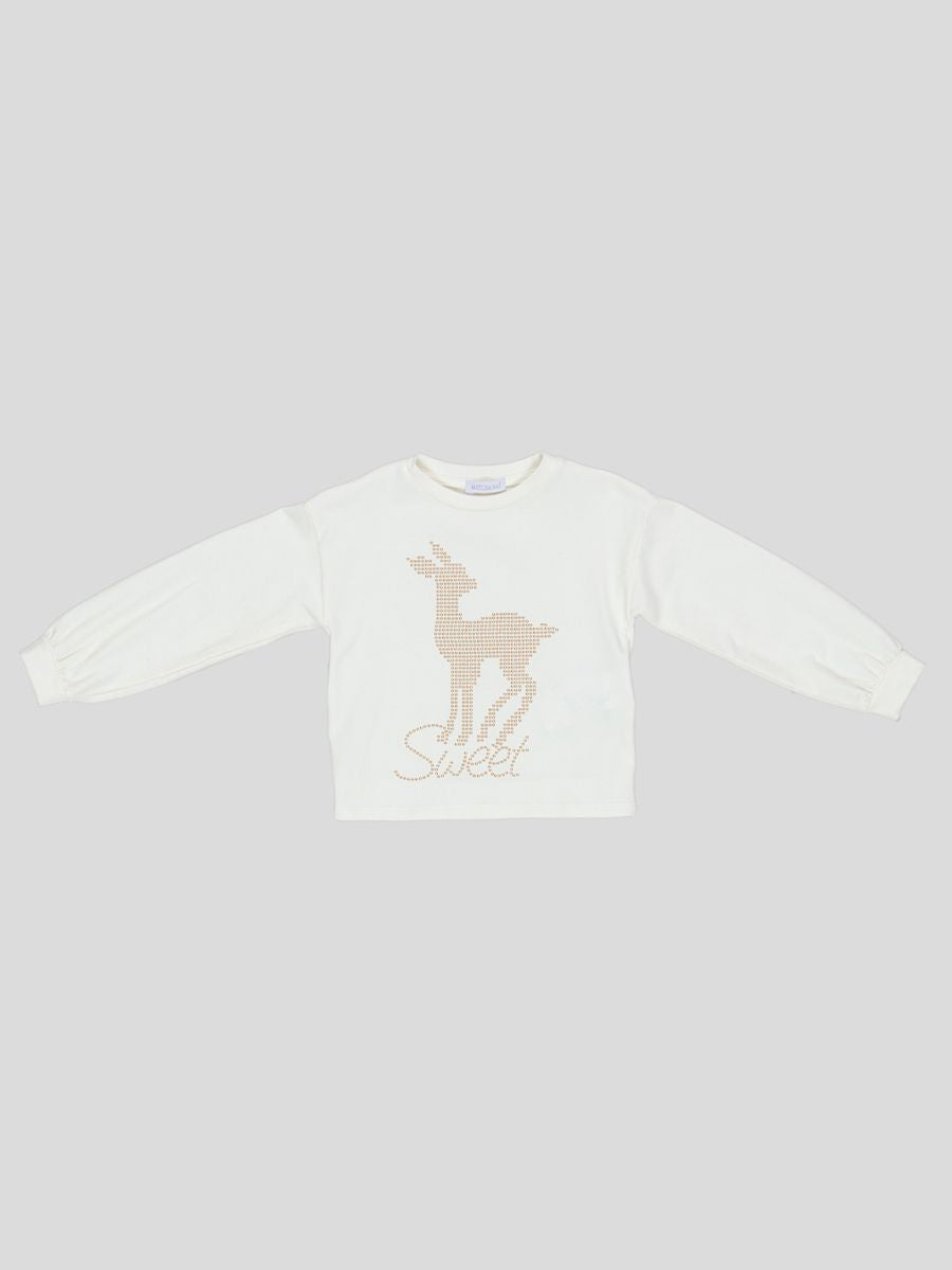 T-shirt girocollo manica lunga corta. Polsi con elastici disegno centrale di un Daino decorato con borchie dorate
