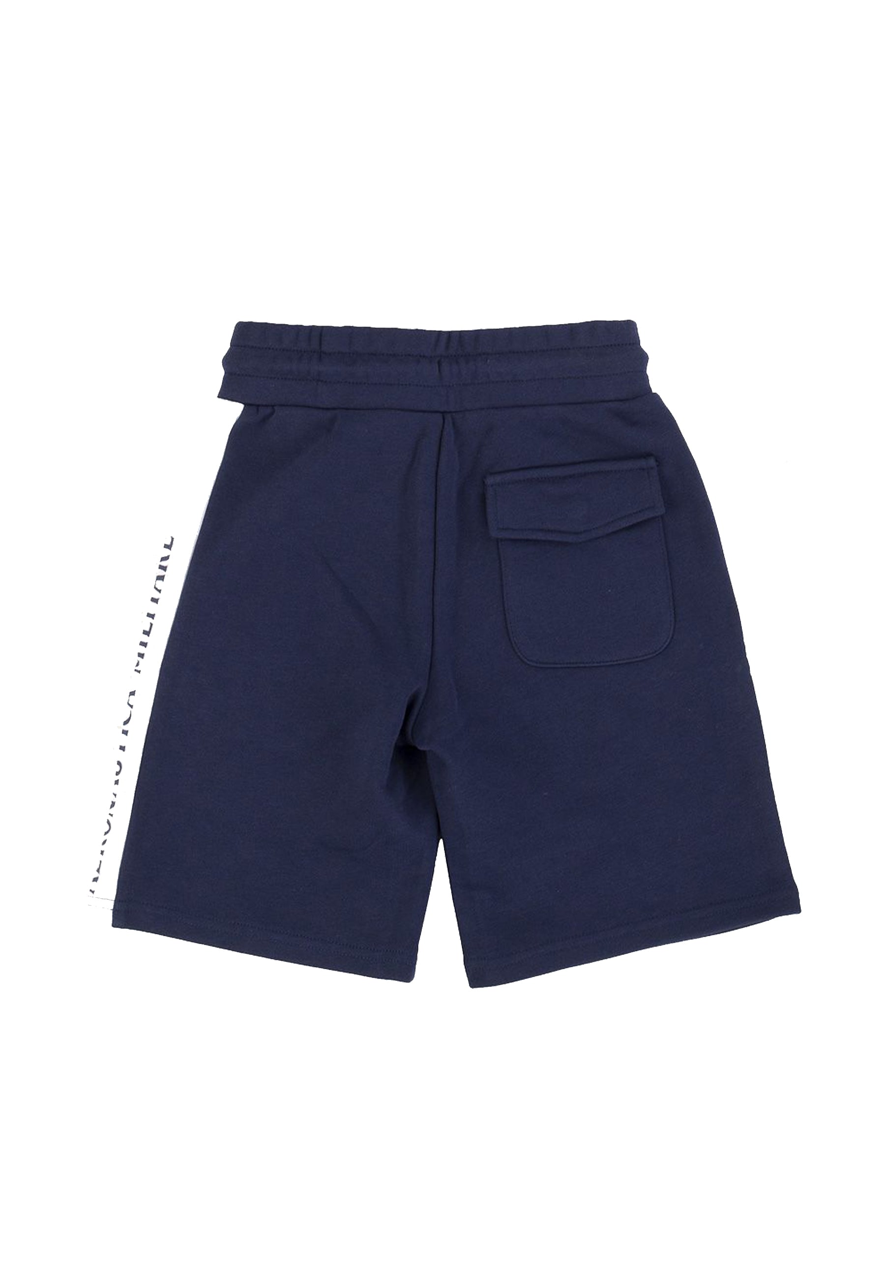Bermuda tinta unita in felpa con elastcio a girovita con cordino regolabile. Tasche frontali e banda laterale con Brand. Patch Bandiera frecce con ricamo su lato frontale