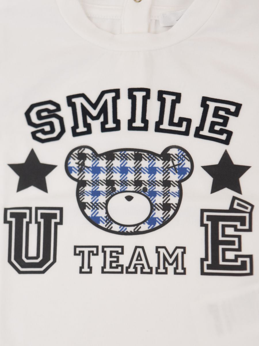 T-shirt girocollo a manica lunga tinta unita. Stampa frontale SMILE. Polsi con elastico.Bottoni a pressione fino alla taglia 2 posteriore per facilitare la vestibilita