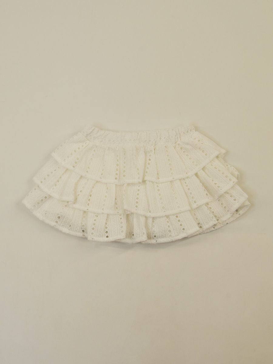 Gonna tinta unita in pizzo con girovita elastico. Modello decorato con tessuto lavorato ripreso in tre punti per dare ampiezza