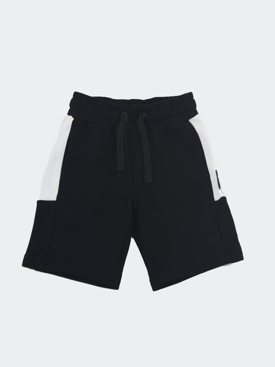 Bermuda tinta unita in felpa con bande laterali a contrasto colore. Tasche a filo e posteriore con QrCode. Girovita con elastico regolabile