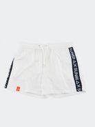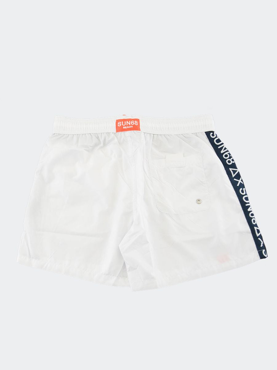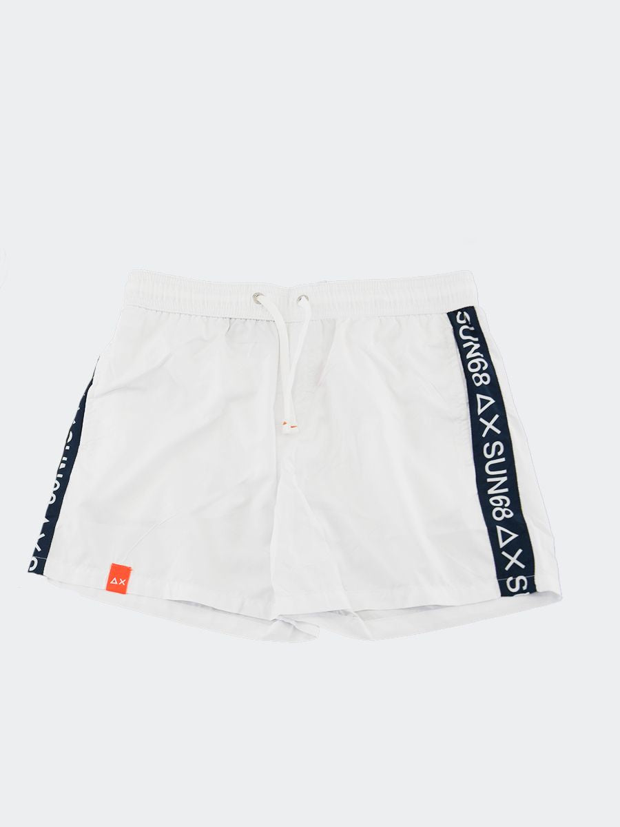 Costume Boxer ad asciugatura rapida con rete interna girovita regolabile da cordino. Nylon tinta unita con etichetta tessita frontale e Banda Tape Brand Logo laterale