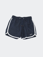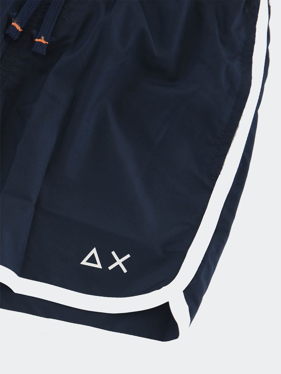 Costume Boxer ad asciugatura rapida con rete interna girovita regolabile da cordino. Nylon tinta unita con etichetta tessita frontale e Bordino a contrasto colore con Logo Stampato