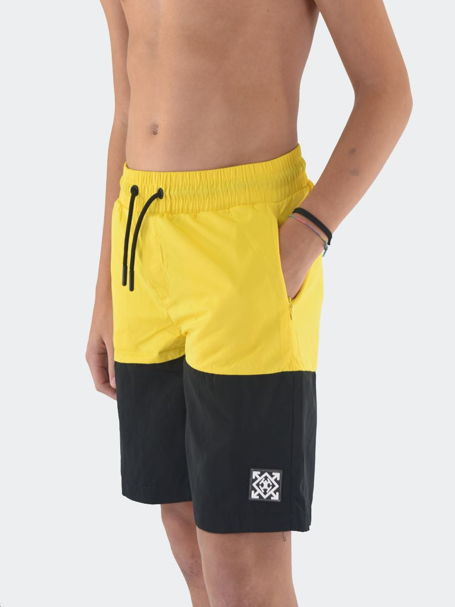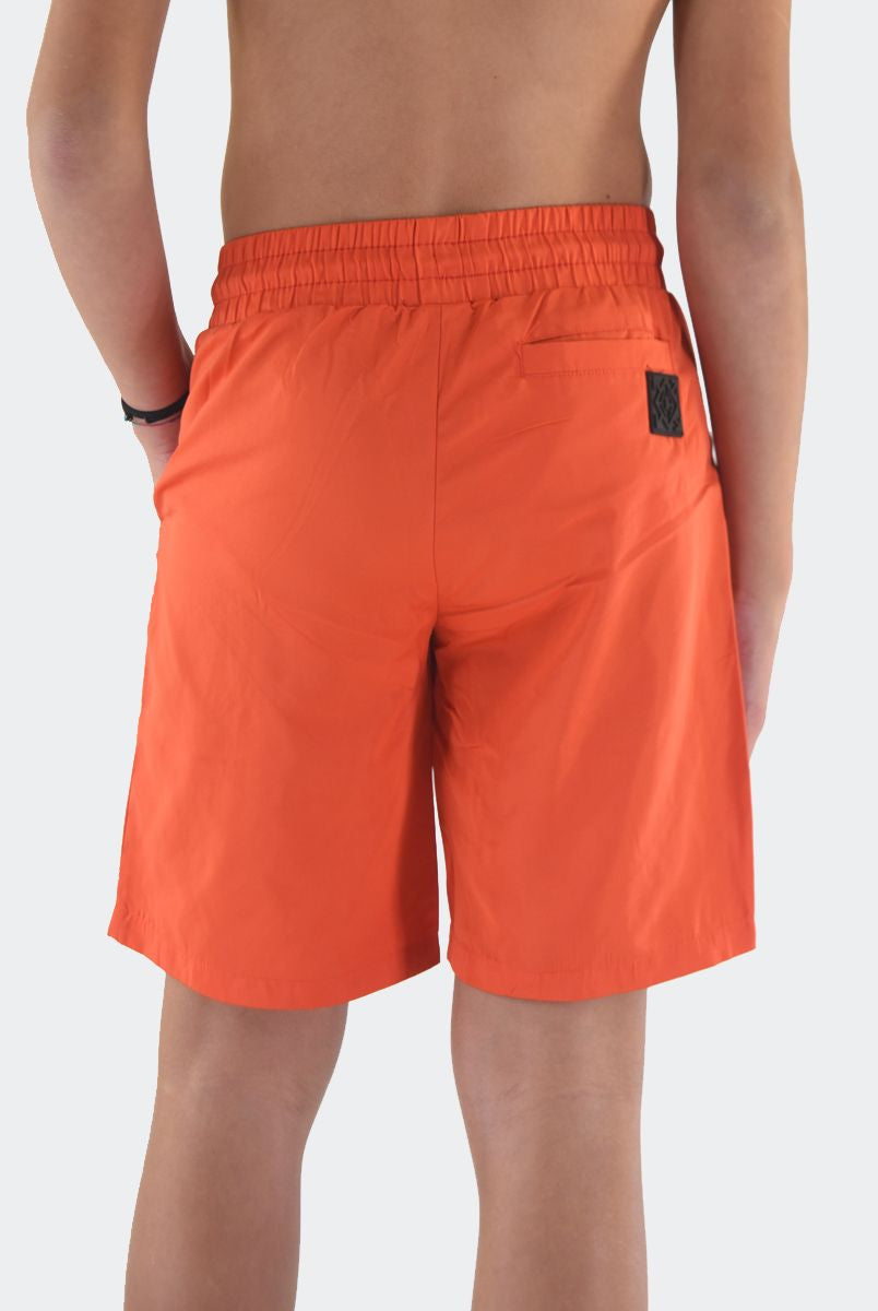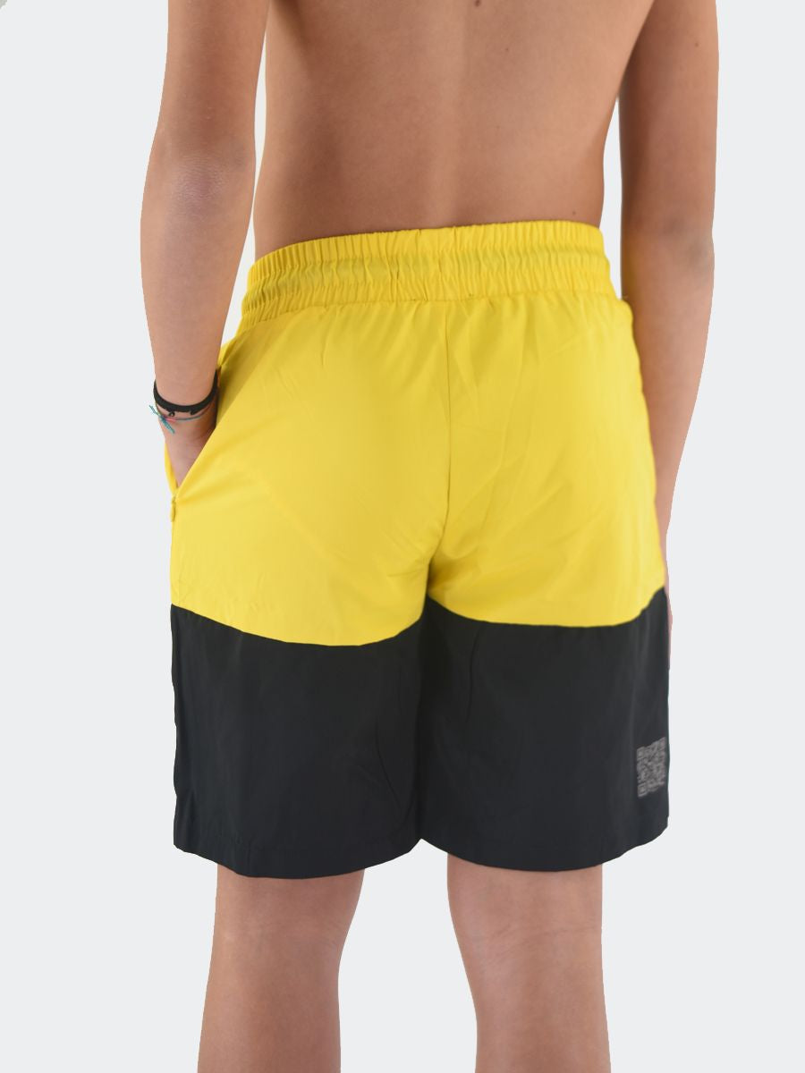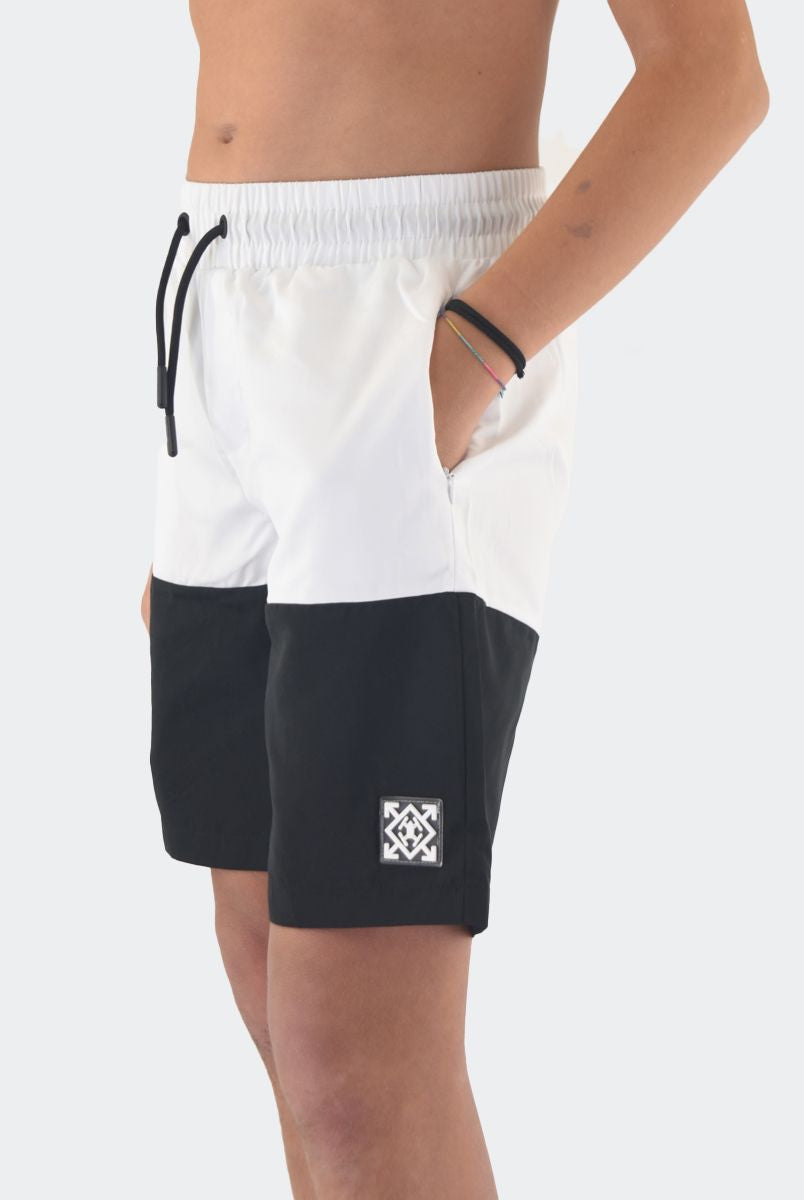Costume Boxer in tessuto Bicolore con Patch logo in silicone sul fondo. Tasche laterali invisibili e girovita con elastico regolabile da cordino. Rete interna e QrCode Logo stampato